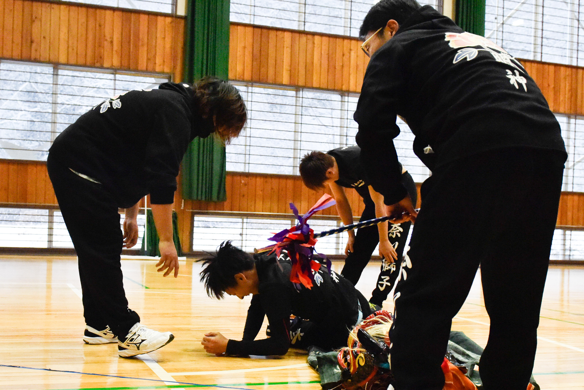 小学校1年生から所属できます。保育園の頃から祭りを見てきている人が多いので、元々リズムを知っている子どももたくさんいて、1ヶ月あれば皆覚えられます。多い時だと週3回の練習をしており、学校終わりの19時くらいから練習を始めます。自分が小さい頃は獅子舞が「かっこいいな」と思っていて、迫力がある印象でした。一番は薙刀のシーンで、とても激しい踊りです。