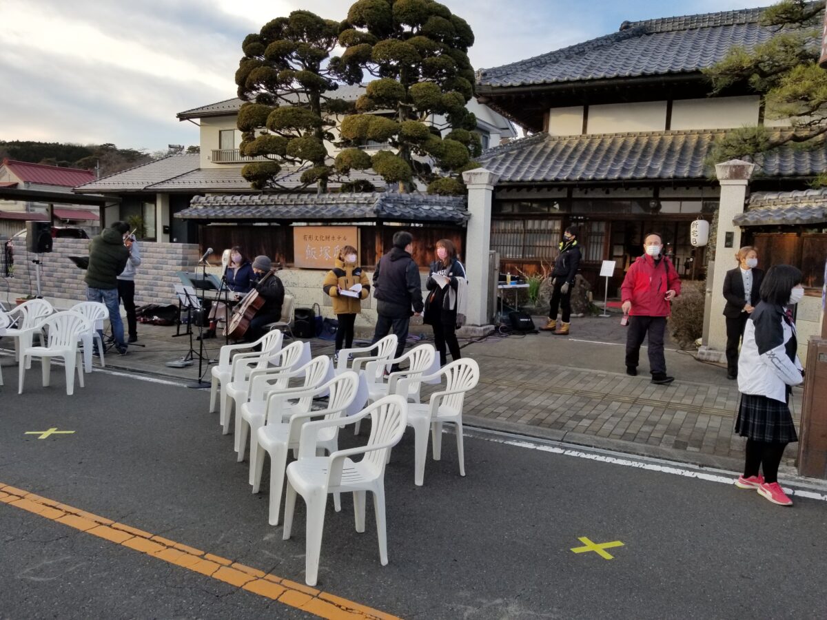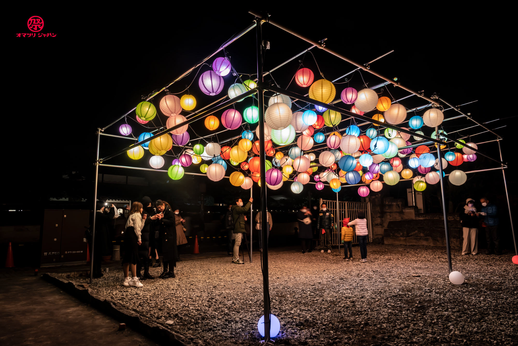 まず、オープニングイベントとして、飯塚邸の前で実行委員長などの挨拶、その後は生演奏と共に色とりどりの100個ものランタンが空に浮かびました。本来は最終日のクローズイベントでは300個のランタンを打ち上げる筈でしたが、コロナウイルスの感染拡大に伴ってセレモニーは中止となり、ランタンについても混雑を防ぐために、1/29(土)・1/30(土)・2/5(土)・2/6(土)の4回に分散して打ち上げる事になったそうです。