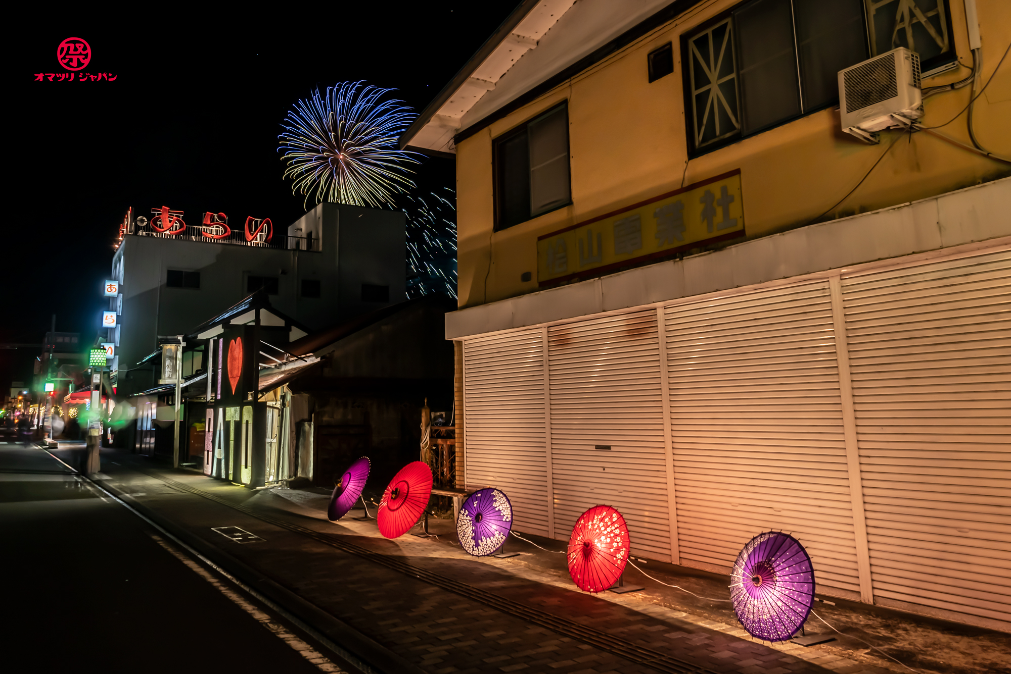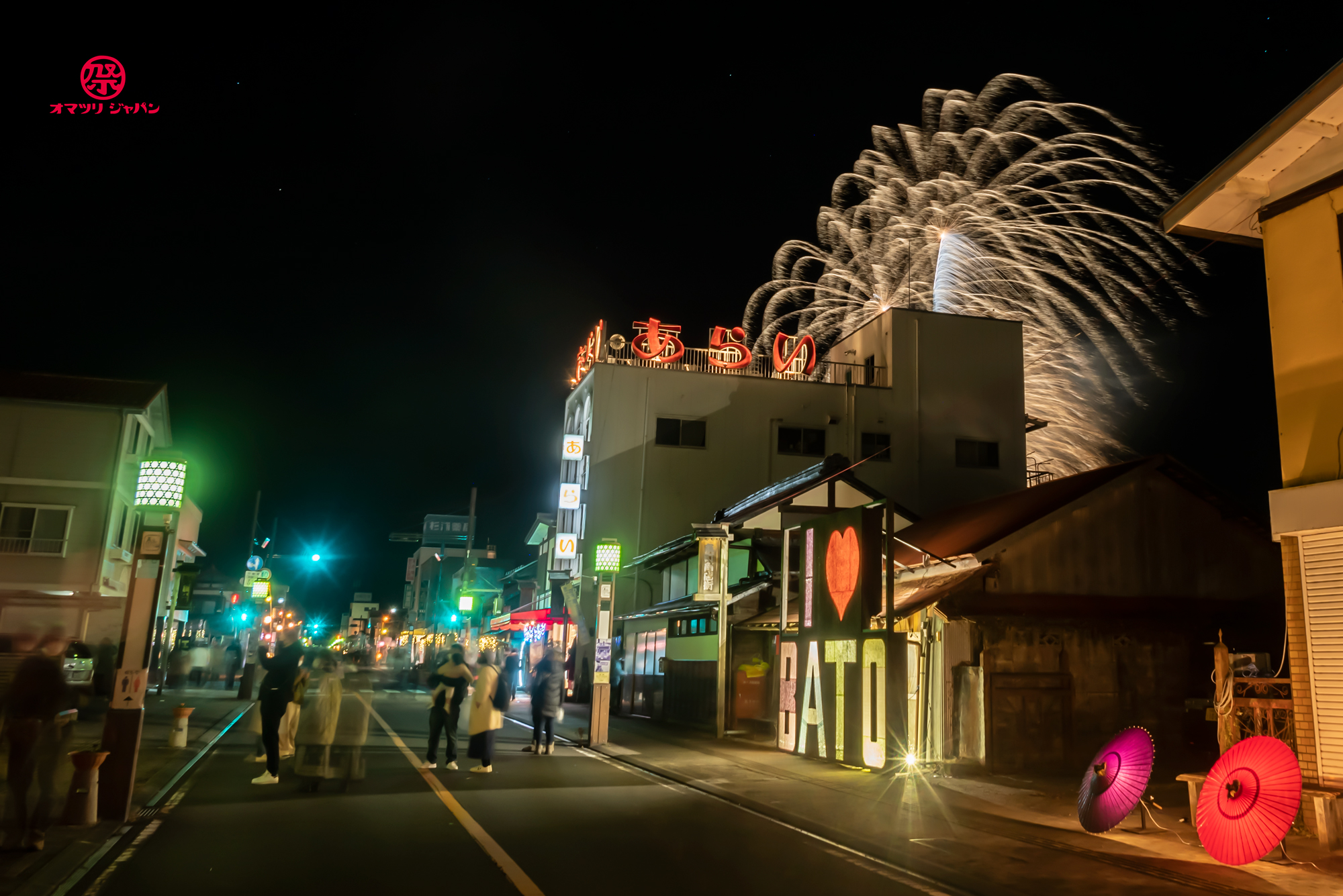 担当煙火店は栃木県那須烏山市の木下煙火店。打ち上げ時間は約20分で最大号数は4号玉(開花直径約120m)となります。商店街からだと大きい花火は何とか大丈夫なのですが、小さい花火は建物に隠れてしまい音だけになってしまいます。花火をしっかり見るのであれば、打ち上げ場所の武茂川河川敷で見るのが良いです。