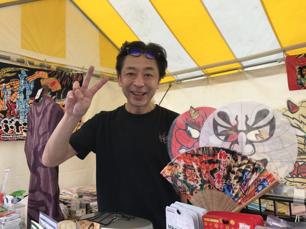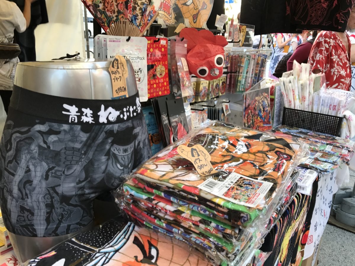 まずは、ねぶた跳人衣装受付所で出会った、青森市の洋品店「甲州屋」の内藤さん。甲州屋さんは、8月初頭に行われる本場のお祭りでも衣装レンタルや販売をされていて、毎年中野にも来ていただいています。ねぶたTシャツや文具など、お土産はビックリするほどスタイリッシュ!このお祭りについて伺うと