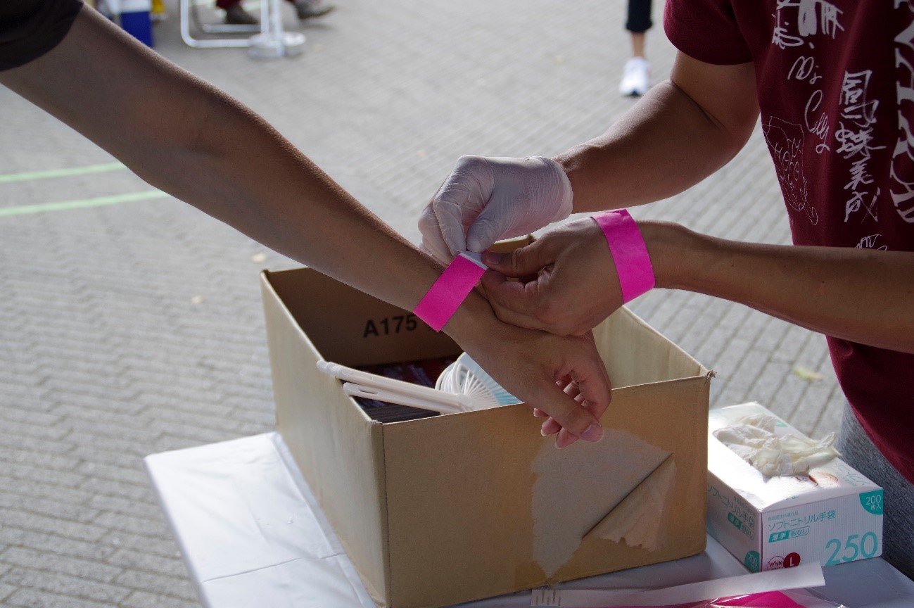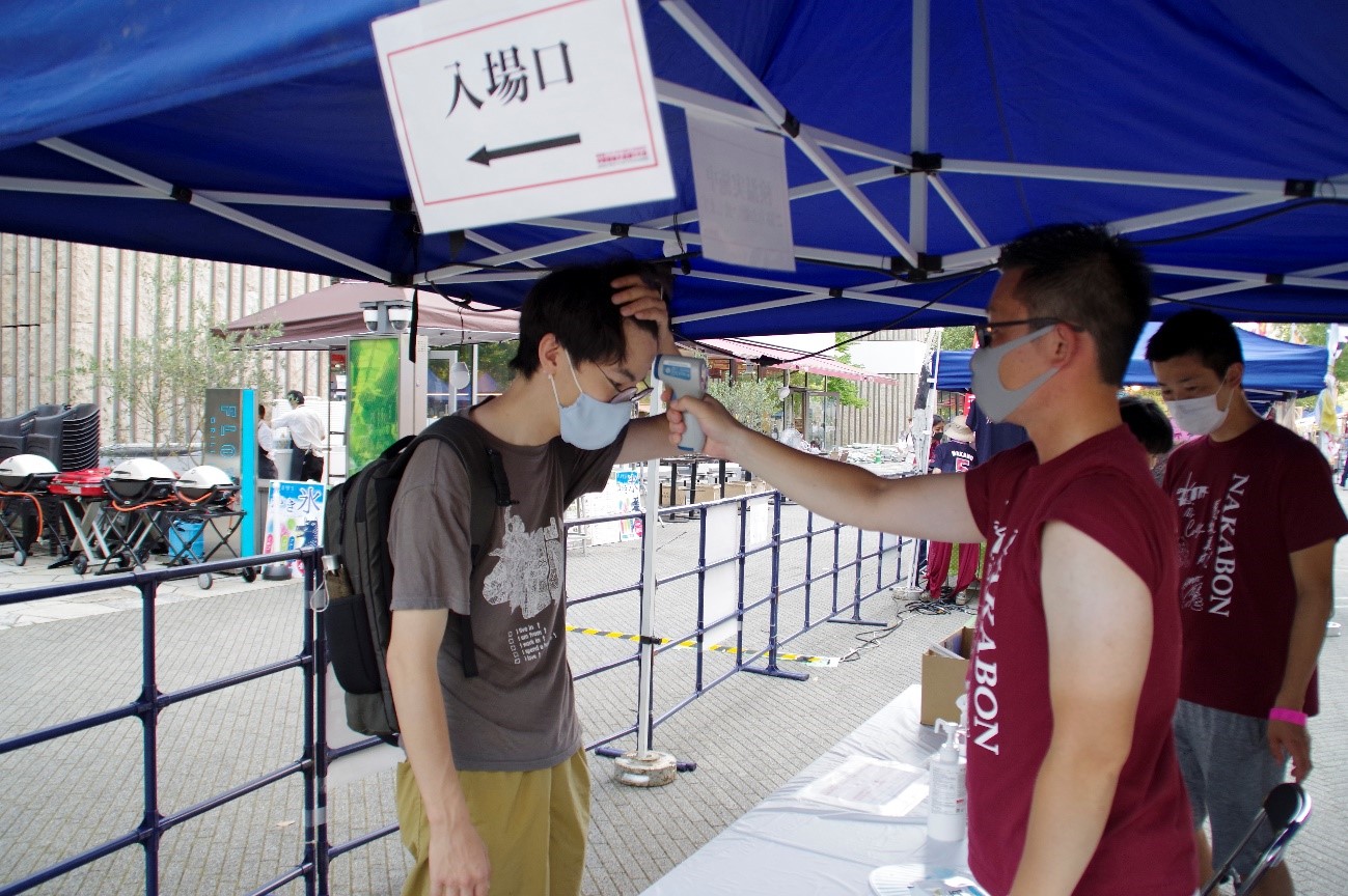 会場を柵で囲い、入場を制限。入場口ではアルコール消毒と体温の測定、氏名の記録を行っていました。距離をとって並んでもらうために地面には印がつけられ、売店にはパーテーションが設けられるなど、徹底ぶりがうかがえます。