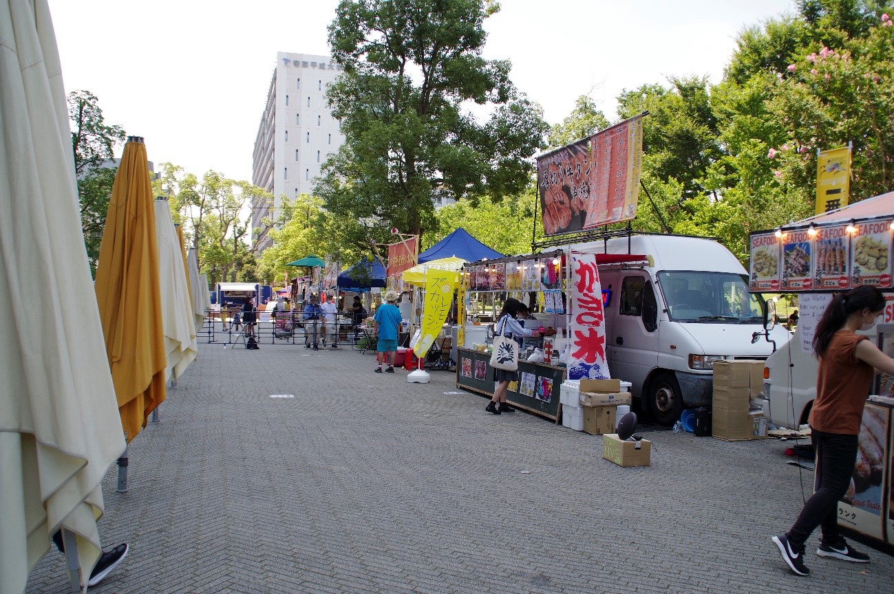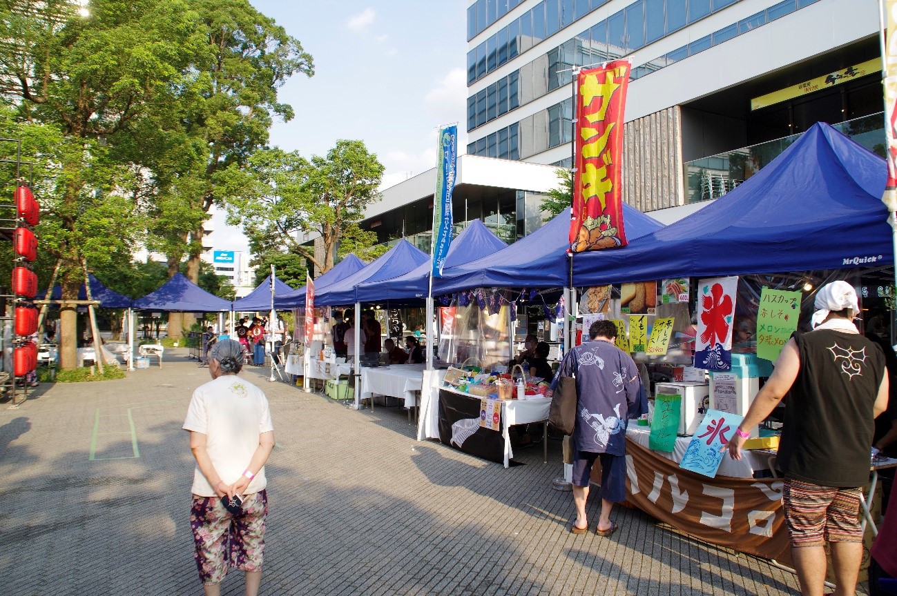 お祭りには欠かせない屋台は北海道のザンギや岐阜県郡上市の醤油フランクなど、今回の中野区大盆踊り大会に関係する地方のグルメや飲食店などが出店。お客さんは限られていましたが、和気あいあいと接客に応じていました。