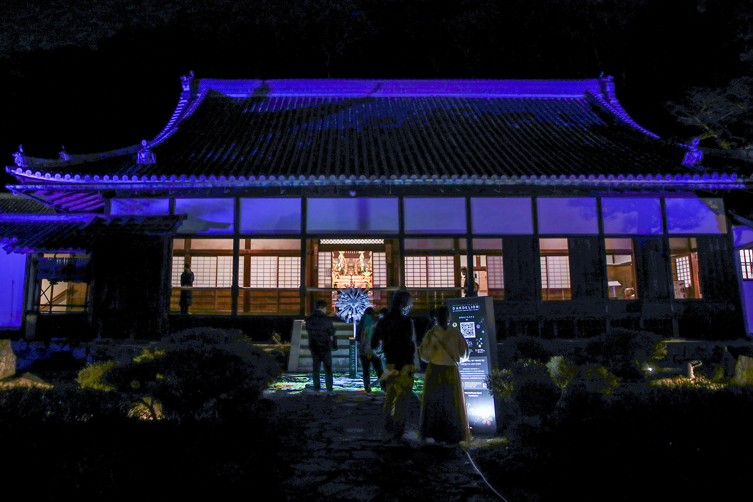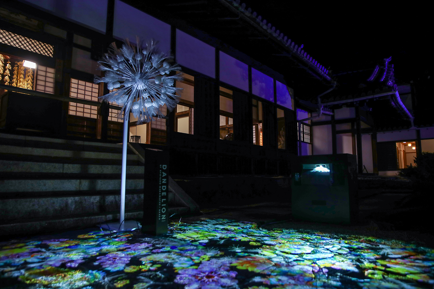 蒼くライトアップされ、荘厳な雰囲気をまとった境内には大きなタンポポの綿毛のアートオブジェ「DANDELION PROJECT」が展示されています。