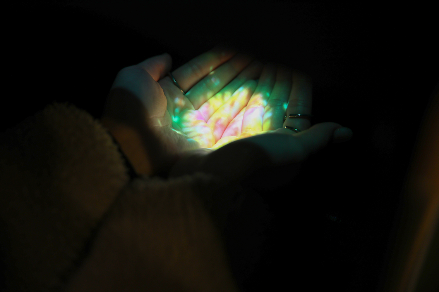 手を差し込んでみると、光の花が手のひらに映し出されます。