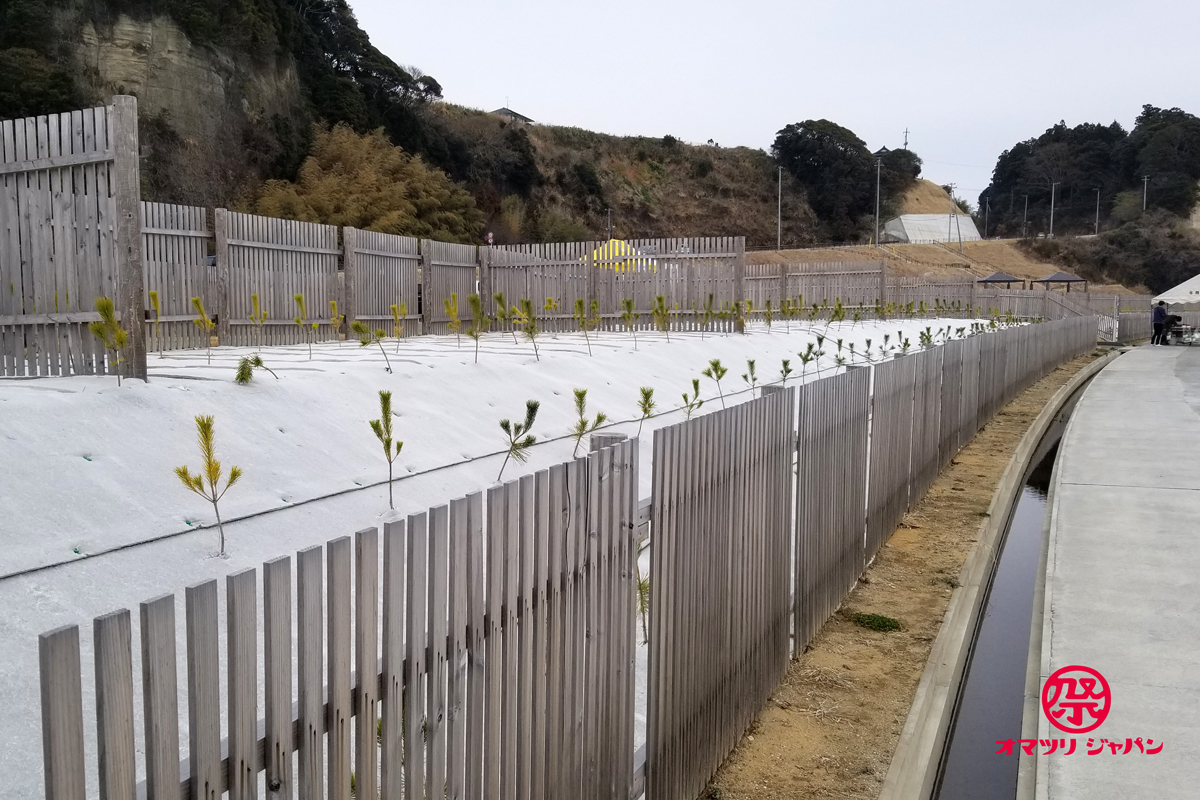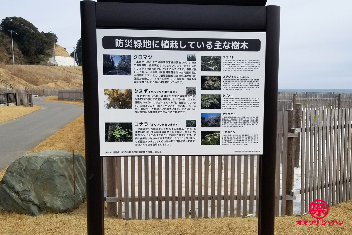 以前は津波で壊滅状態だった場所に苗木が植えられ綺麗な防災緑地として整備されていました。岩手県陸前高田市の有名な奇跡の一本松の事もあり、他の防災緑地でも松が植えられる事が多い様です。(防災緑地とは津波が来た場合に植えた木々や敷地内の盛り土で津波の勢いを和らげたり、船などの住宅地への流れ込みを防ぐ効果、また避難所としての役割もある)