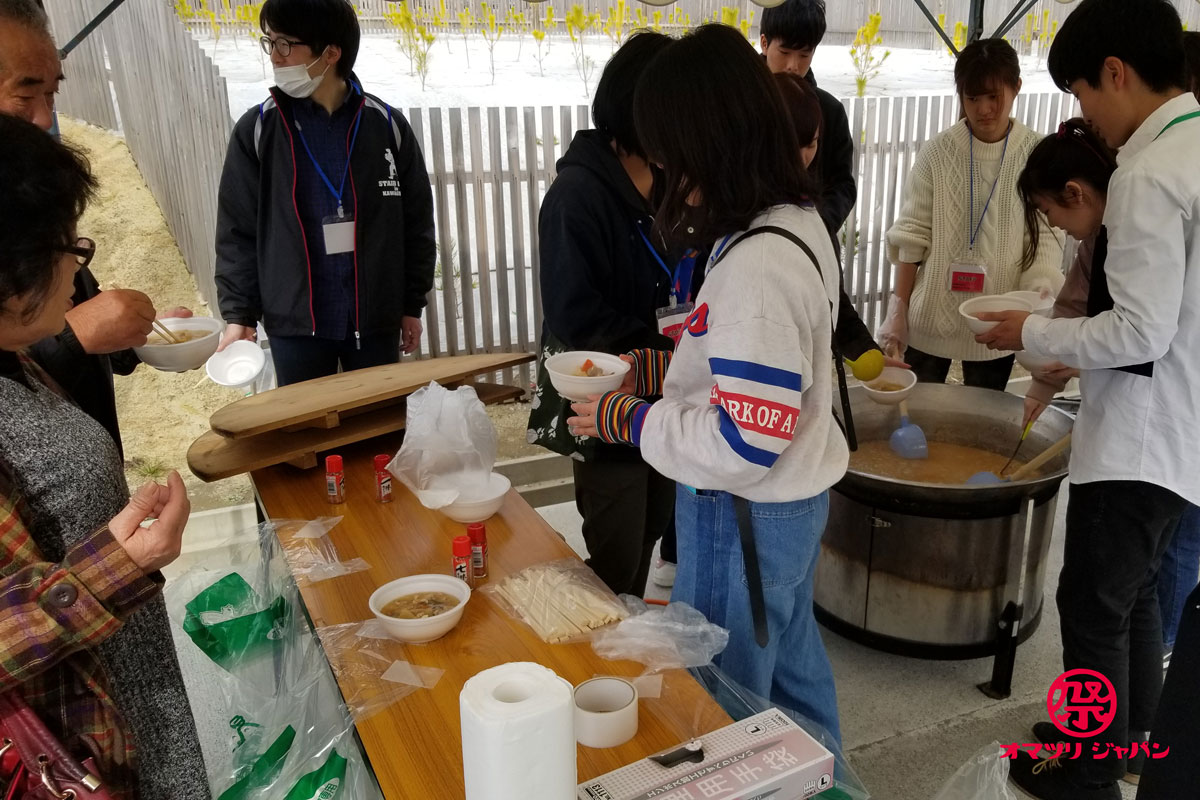 今回は、地元の方にこの防災緑地を知って貰おうと周辺地域に回覧板やチラシで告知した成果もあり、多くの人が会場に来られていました。受付で署名を行うと奥のテントでは豚汁の無料サービスが用意されています。大鍋で作る豚汁は具だくさんでかなり美味しかったです!