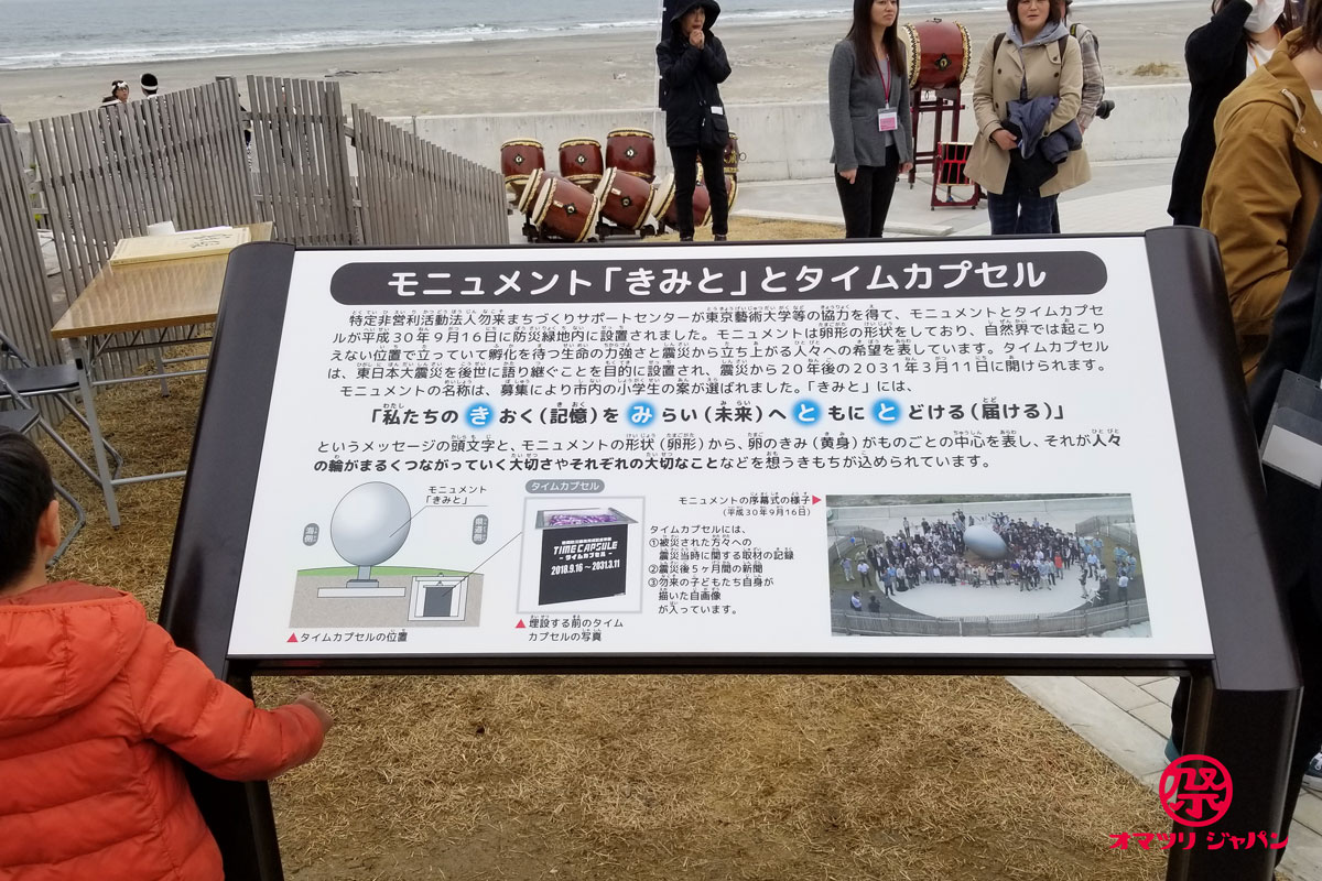 岩間防災緑地のシンボルである東京藝術大学の協力で作られた卵型のモニュメント。なこそ復興プロジェクトによる7年越しの事業であり、この地下には2031年3月11日に開けられるタイムカプセルが埋まっています。カプセルの中には震災を体験した人による資料などが入れられています。