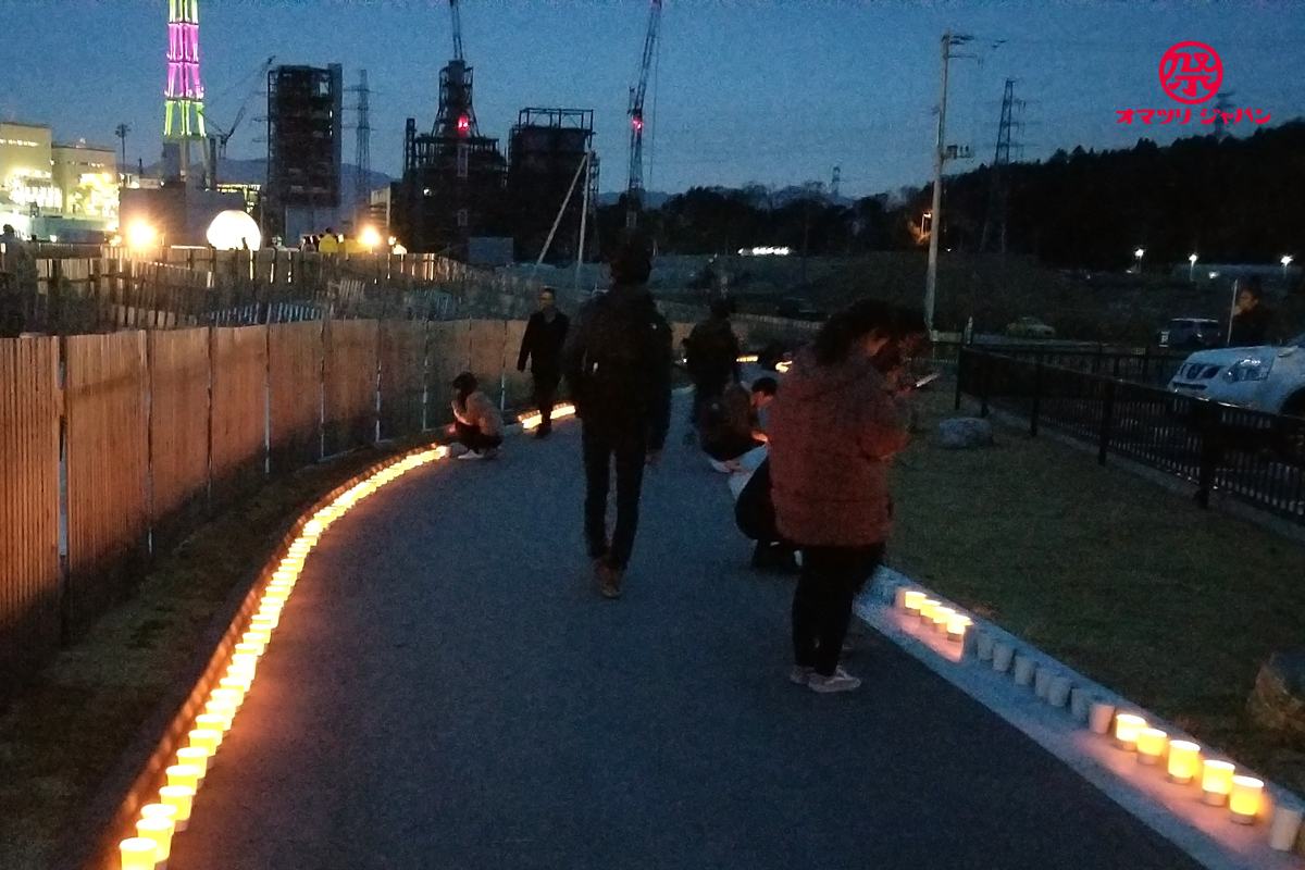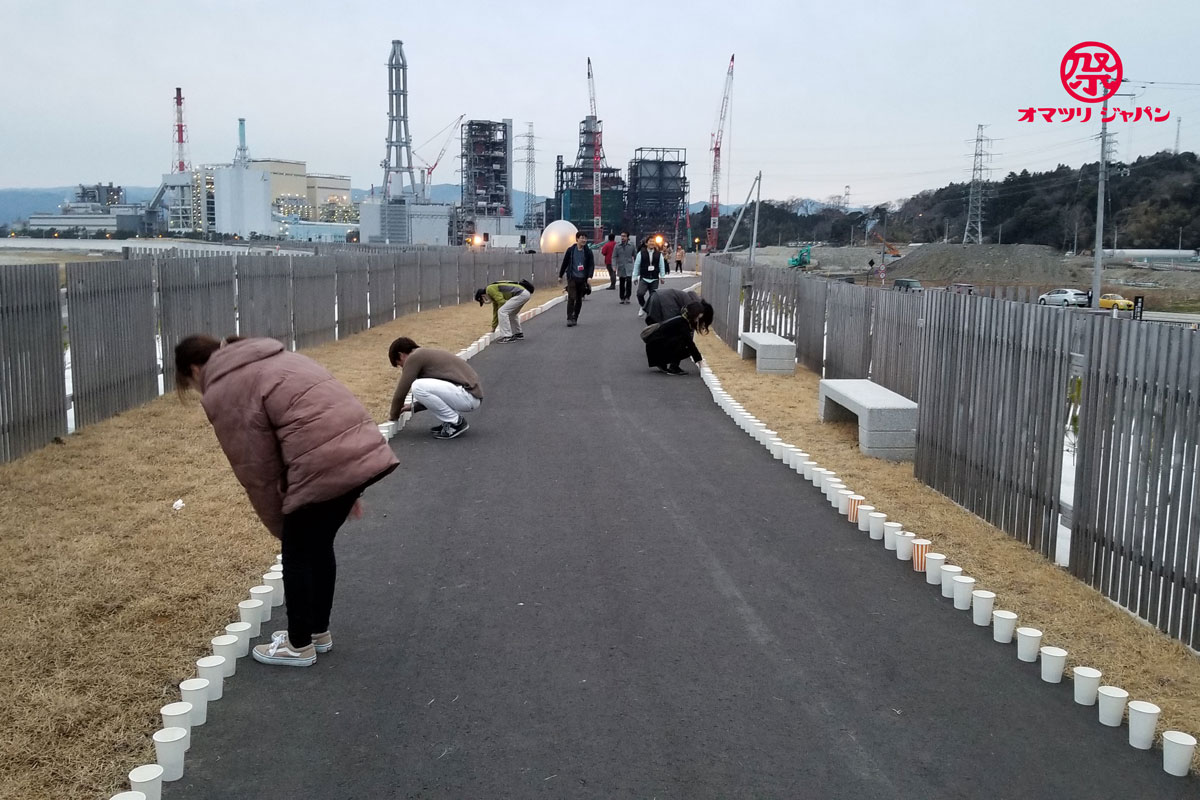 防災緑地の入口からモニュメント「きみと」までの道にキャンドルが並べられます。かなりの数を用意しなくてはいけないので、まだ日のある時間から設置・点火とボランティアスタッフが頑張ってくれていました。