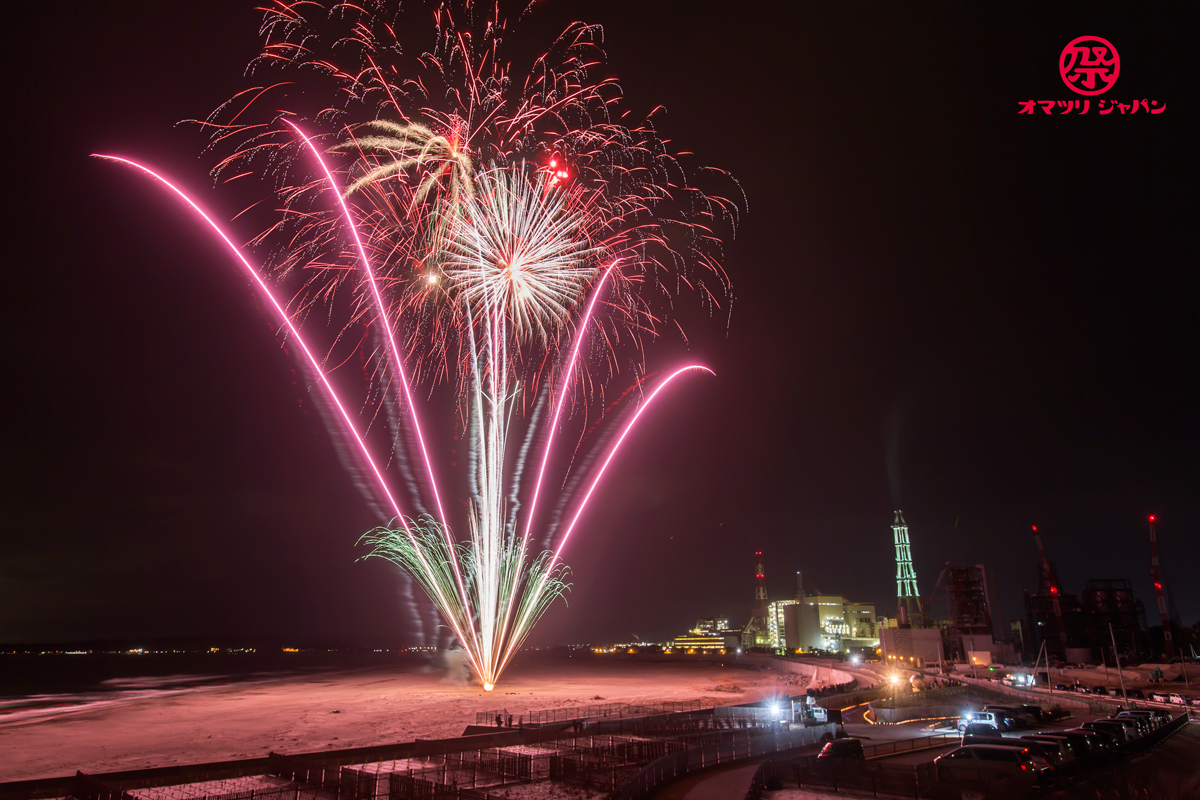 花火を見にくる人達の通り道にもなるので暗い道を歩く必要もなく、ちょうど火力発電所のライトアップも点灯され花火の打ち上げ時間までを待ちます。