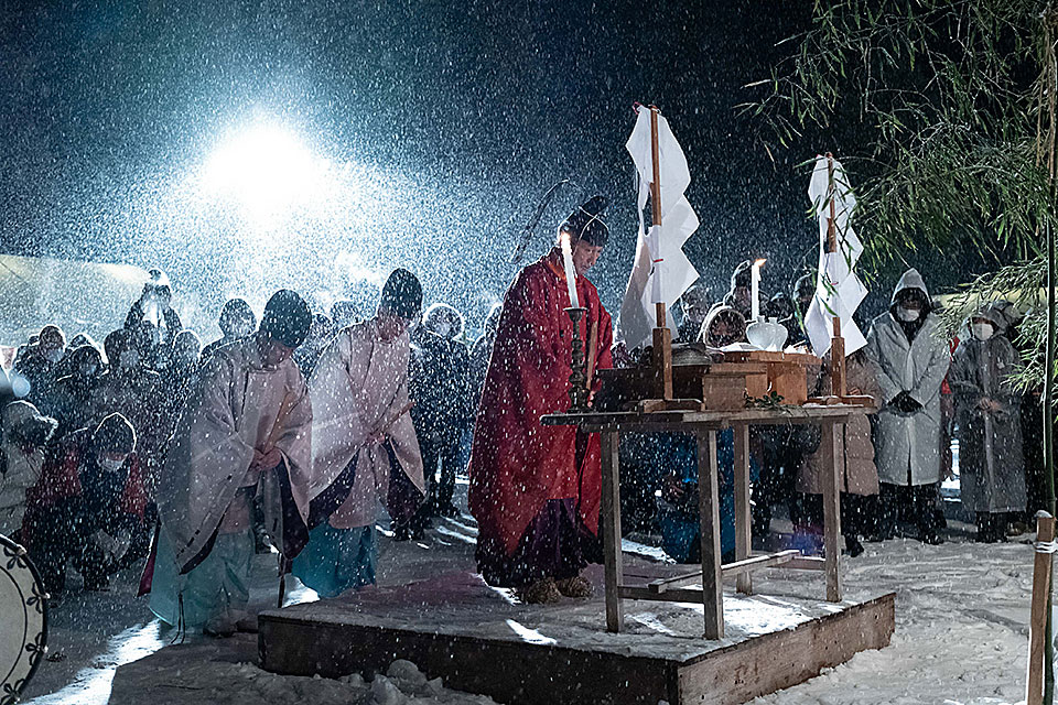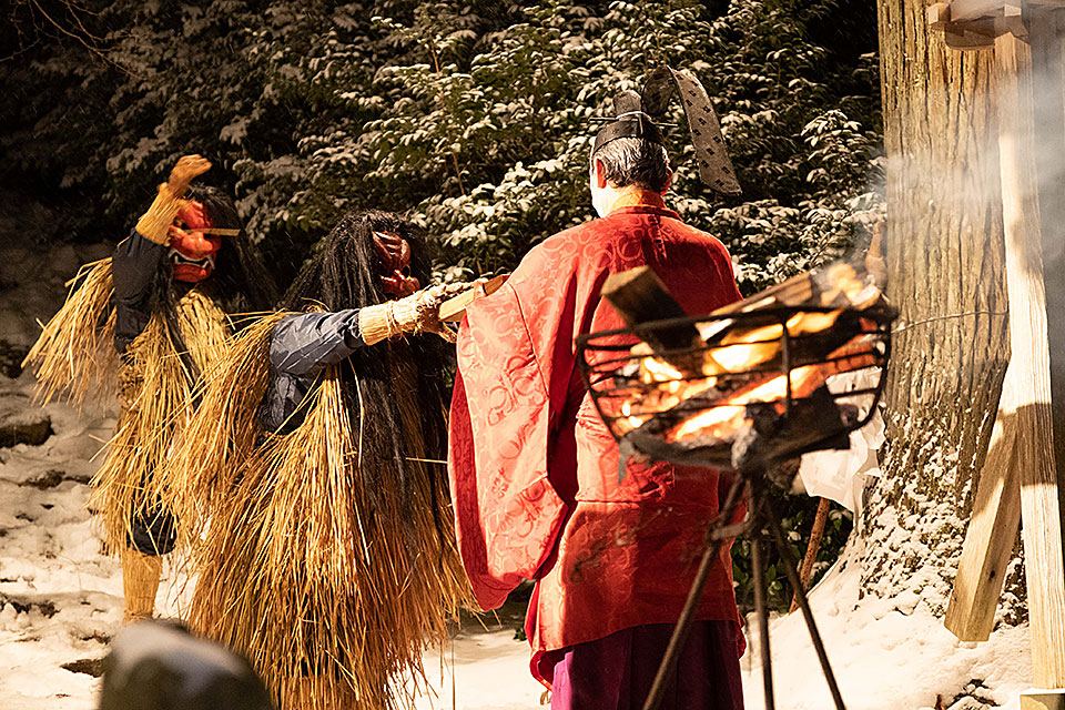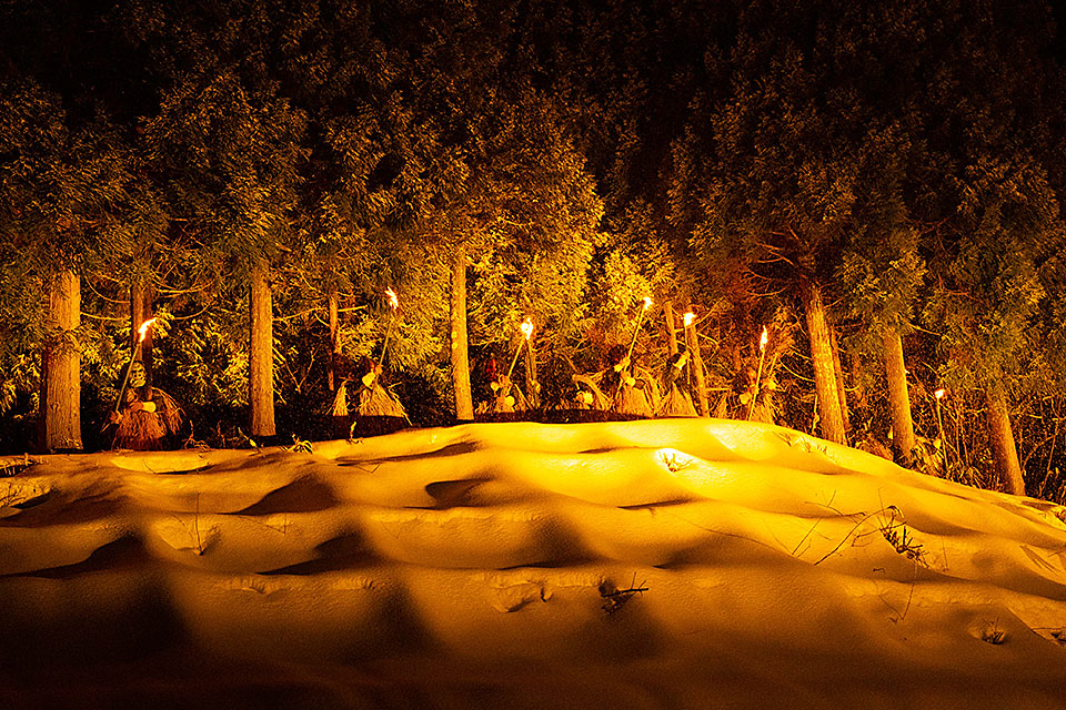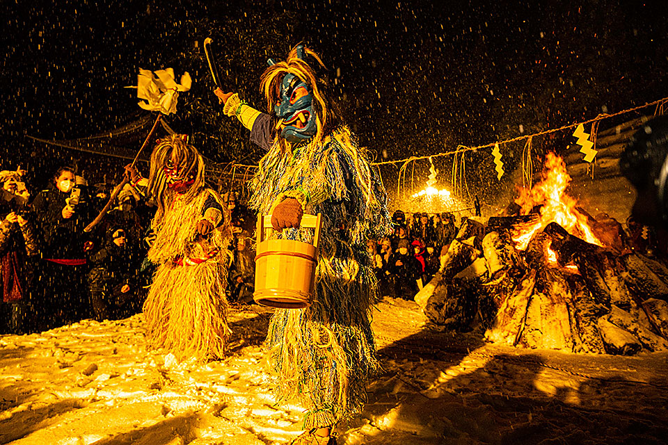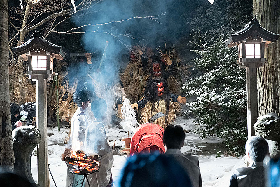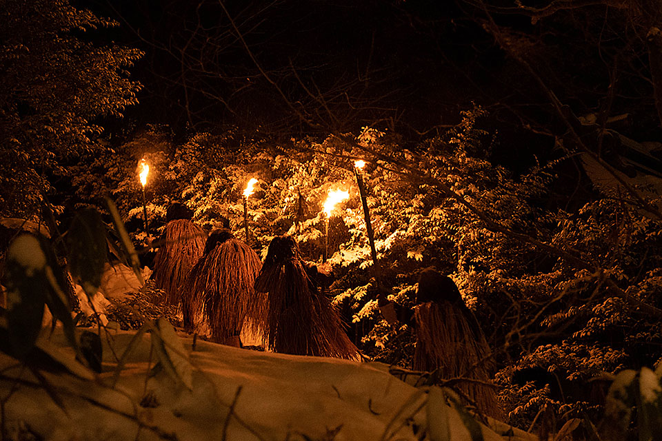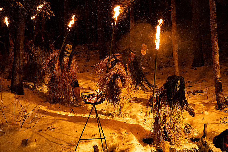 雪の斜面を、列をなして降りてくるなまはげたち。彼らの目的は、神聖な柴灯火によってあぶられた大餅を受け取ること。山に持ち帰られた大餅は山の神様に捧げられます。つまり、なまはげたちは神の使者でもあるのです。