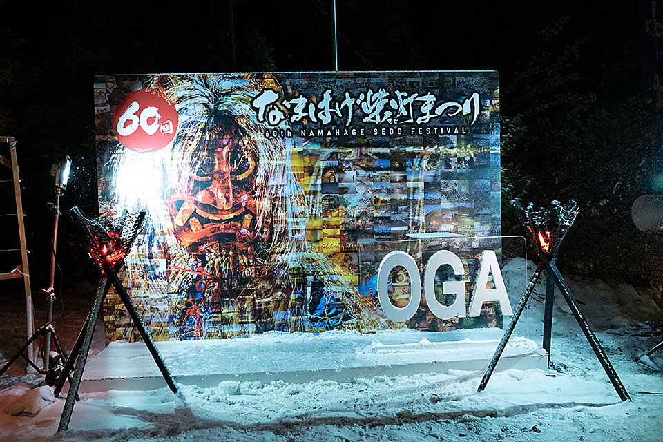 石段を上り切ると、かがり火と60周年を記念した記念撮影用大型フォトパネルがお出迎え。これまで積み重ねてきた歴史に対する誇りと、60回目の「なまはげ柴灯まつり」に対する意気込みのようなものを感じることができました。