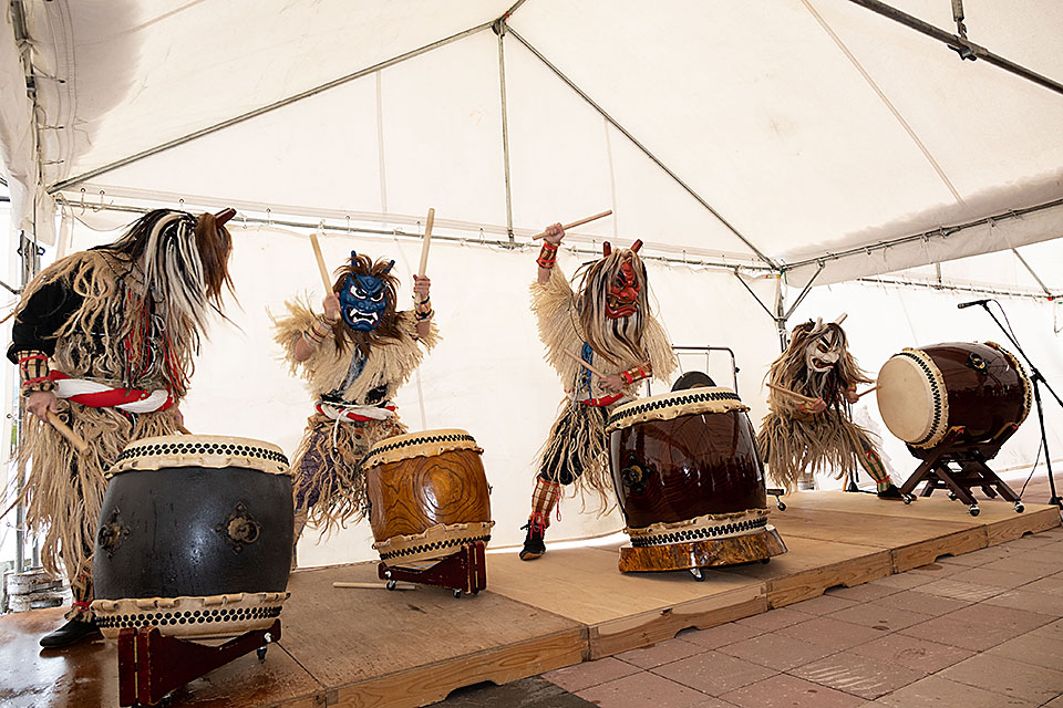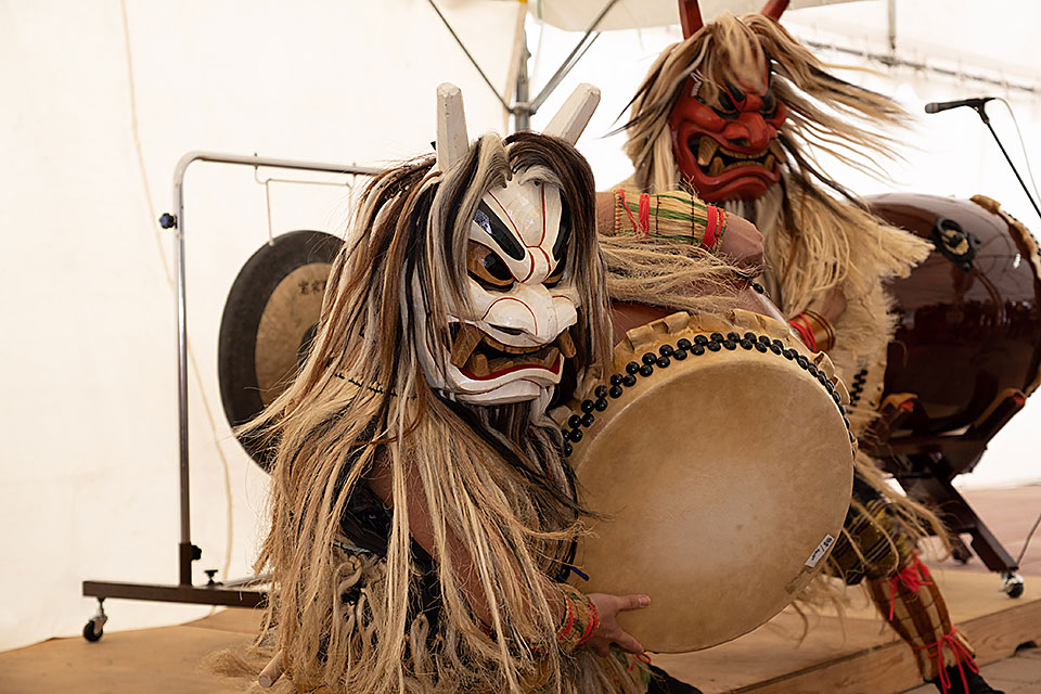 屋台グルメを眺めていると、会場に複数のなまはげたちが乱入! 大迫力の「なまはげ太鼓演奏」が始まりました。