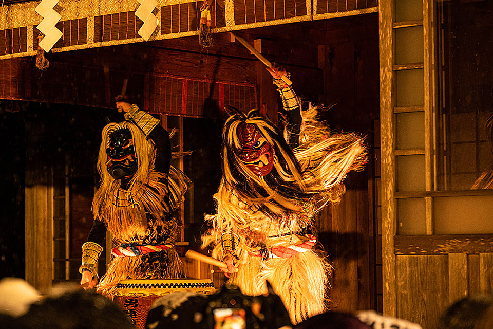 鬼気迫るなまはげの表情。大地を揺るがすかのような力強いバチさばき。美しくライトアップされた中での来訪神による組み太鼓という、まさに唯一無二のステージが展開されます。