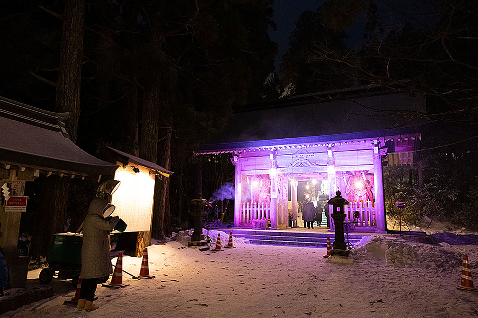 日も暮れてきたので道の駅を離れて「なまはげ柴灯まつり」の会場でもある、真山神社へと向かいます。国定公園に指定されるほど豊かな自然が広がる男鹿半島の中腹は、事前の「雪予報」のとおり、少しずつあたりが吹雪いてきて、まるで異世界に飲まれていくような、そんな不思議な気分になってきます。