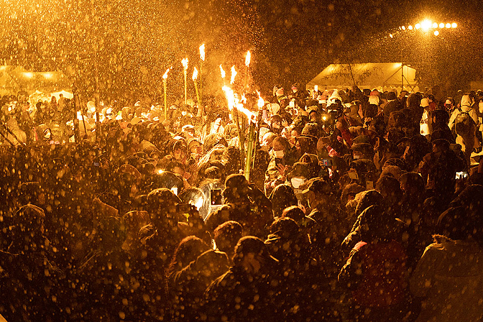大迫力の「なまはげ太鼓」が終わると、人々の目が雪山の上に注がれます。現れたのは松明をかざした15体のなまはげたち。「なまはげ入魂」の後に山に入っていったなまはげたちが、再び里に戻ってきます。
