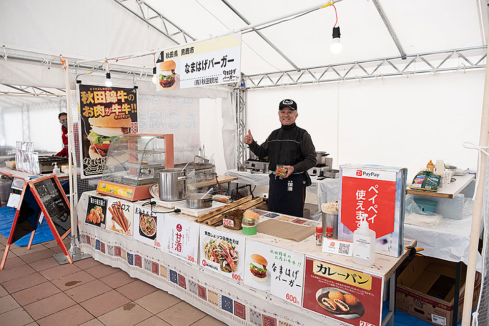 海の幸から山の幸まで、男鹿のさまざまな物産が集うこちらの施設ですが、「なまはげ柴灯まつり」の期間中は、駅前の広場「オガアイランドパーク ハブアゴー」とともに、サテライト会場として利用され、男鹿のグルメ屋台が並んだり、なまはげ太鼓の演奏が行われたりと、お祭り気分に満ちた空間へと変わります。