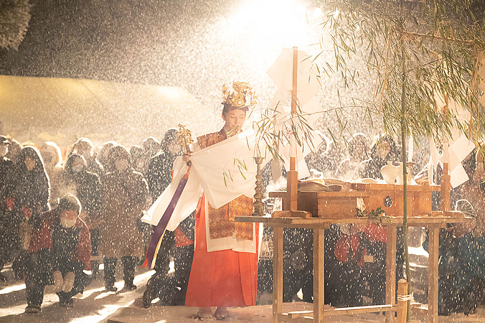 お祭りはまず「鎮釜祭(ちんかまさい)」「湯の舞(ゆのまい)」と呼ばれる神事から始まります。厳かに執り行われる儀式と、それを静かに見守る観衆たち。神聖ななまはげたちを迎える場を、こうやって整えていっているのでしょうか。