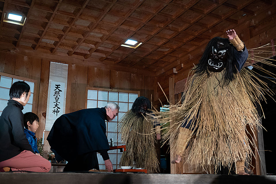 雪の斜面を、列をなして降りてくるなまはげたち。彼らの目的は、神聖な柴灯火によってあぶられた大餅を受け取ること。山に持ち帰られた大餅は山の神様に捧げられます。つまり、なまはげたちは神の使者でもあるのです。