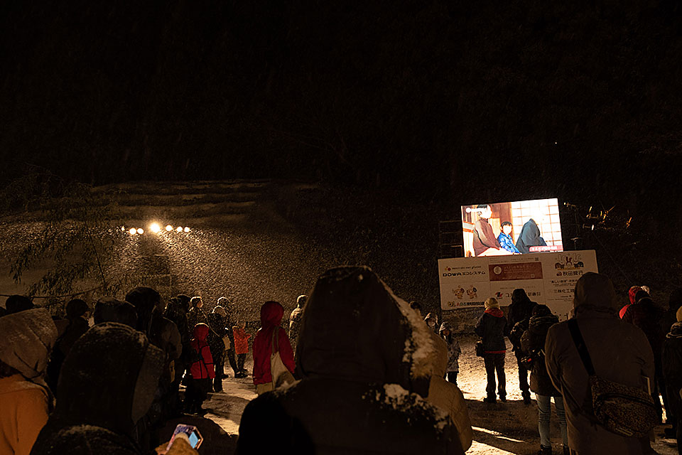 大迫力の「なまはげ太鼓」が終わると、人々の目が雪山の上に注がれます。現れたのは松明をかざした15体のなまはげたち。「なまはげ入魂」の後に山に入っていったなまはげたちが、再び里に戻ってきます。