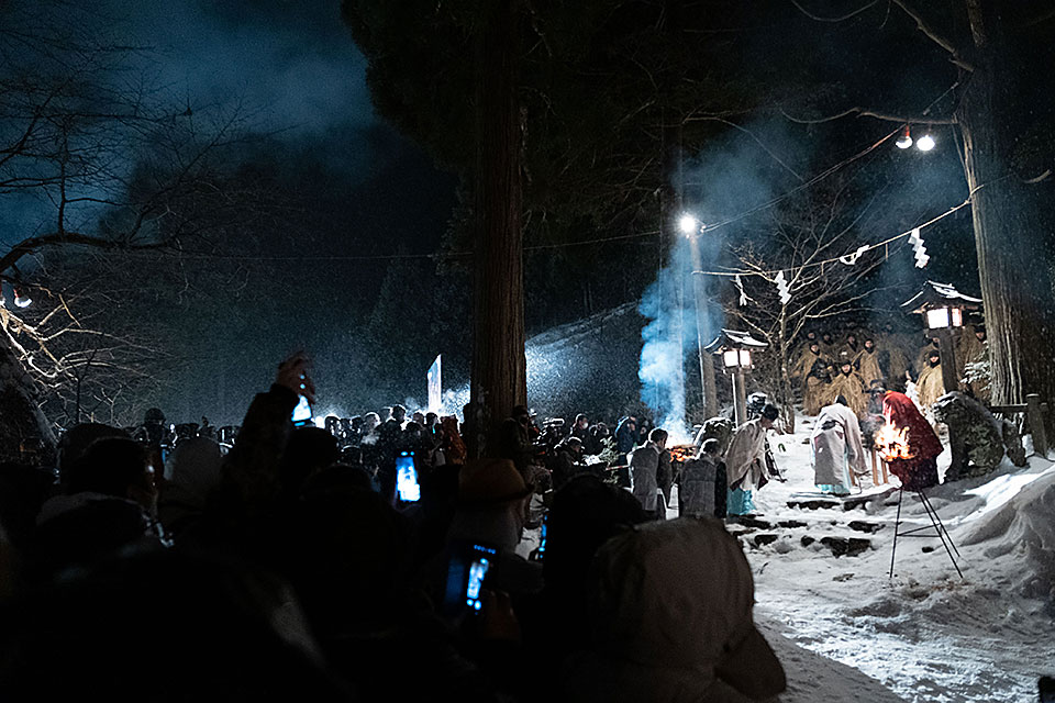 柴灯火で焼かれた護摩餅を神官が捧げます。なまはげはそれを受け取ろうとしますが、神力が宿った餅には、なかなか触れることができません。なまはげが次々とやってきますが、餅に触れられず、不思議な力に弾き返されてしまう。先ほどの、威厳に満ちたなまはげの姿とは対照的なコミカルなやりとりに心がゆるみ、思わず笑みが漏れます。