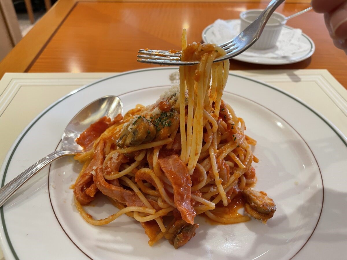 トマトソースの甘味と酸味がさっぱりとしていて、もっちりとしたアルデンテのスパゲティとよく絡んでいます。具材のマッシュルームの香りが噛むとふわっと香り、さっぱりとしたトマトソースとよく合います。また、もう一つの具材のハムも大き目なカットで存在感が抜群! さっぱりソースに肉のうま味がプラスされていきます。