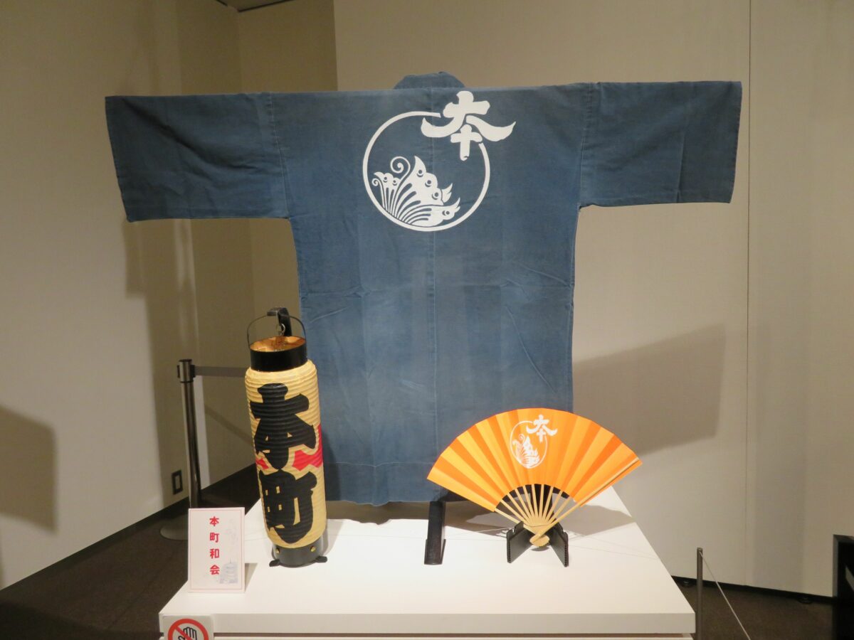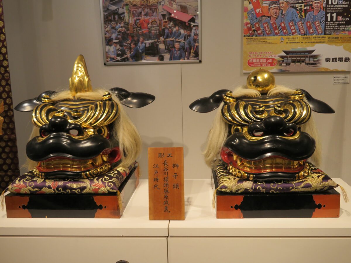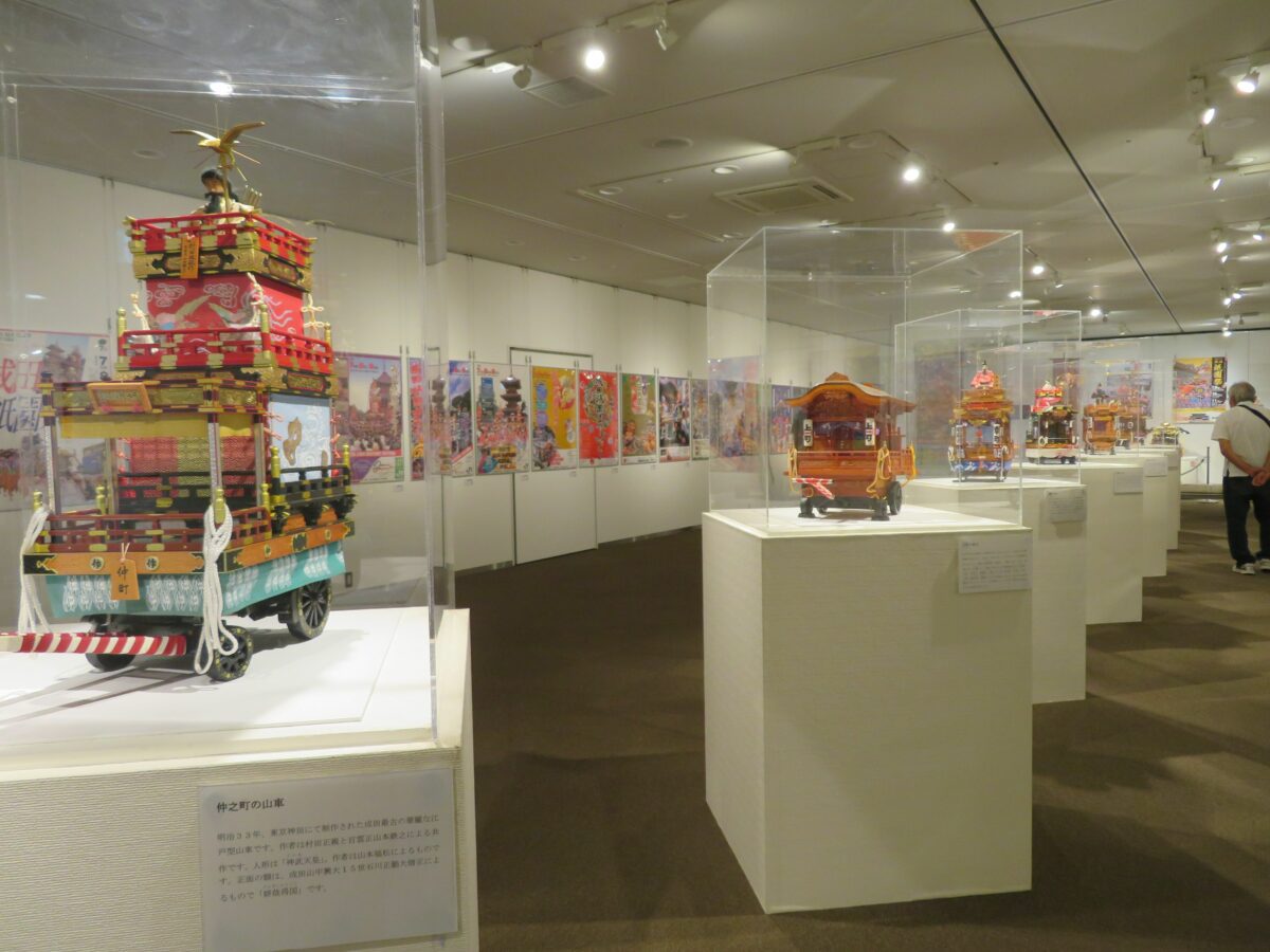 ギャラリーの5階では、中央に「成田祇園祭」の際に巡行する山車や屋台のミニチュア模型が並び、外周を歴代のポスター、写真、獅子頭、半纏、提灯、扇子が展示されています。