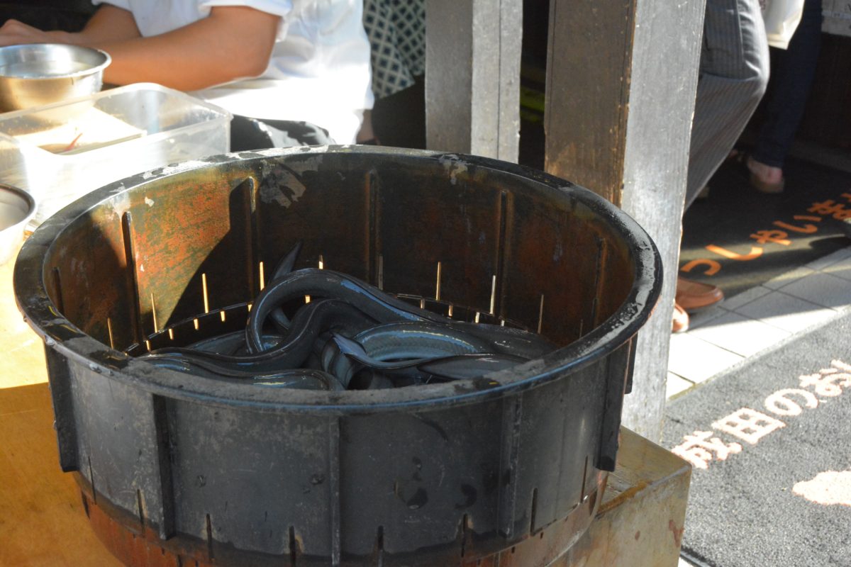 店先で生きたうなぎを調理する「川豊」