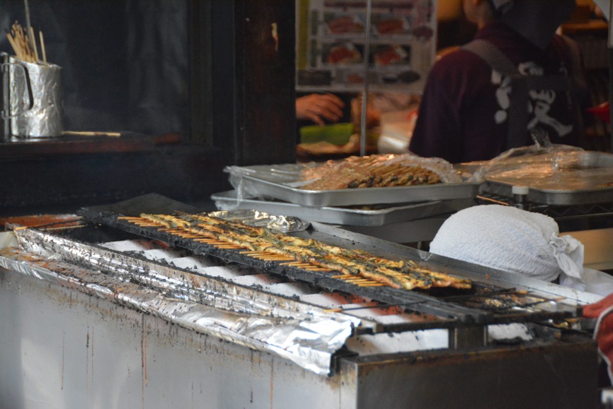 店先で生きたうなぎを調理する「駿河屋」