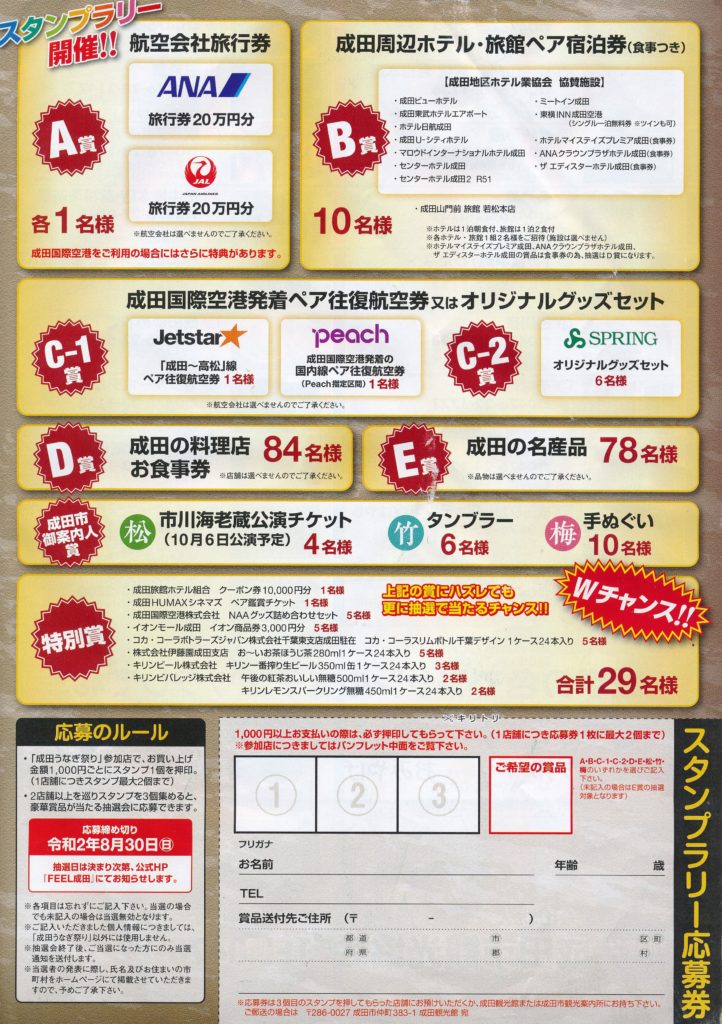 「成田うなぎ祭り」では特別なイベントが行われる訳ではないのですが、協賛の飲食店に訪れてスタンラリーに応募すれば様々な商品をゲットすることという趣向が凝らされています。