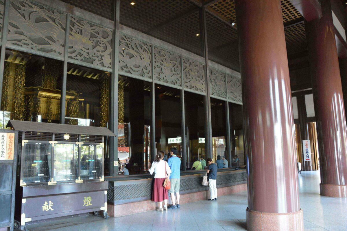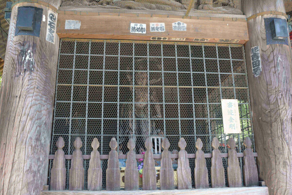 総門を潜った正面は仁王門です。中央の大提灯に書かれる「魚がし」の大きな文字に目を引かれます。東京の築地にある魚河岸の旦那衆が1968年に奉納されたようです。門の両側には密迹金剛と那羅延金剛が奉安され、寺院を力強く守り続けています。