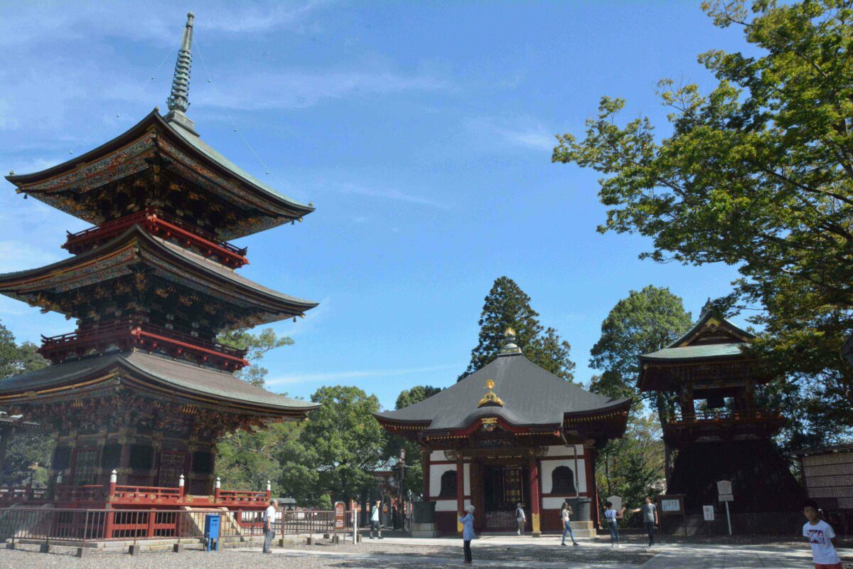聖徳太子堂の南には、三重塔、一切経堂、鐘楼が並び建ちます。三重塔は1712年に建立され、極彩色の彩りに目が引きつけられます。