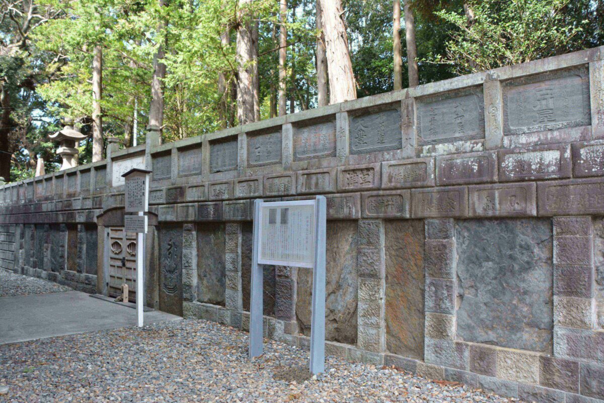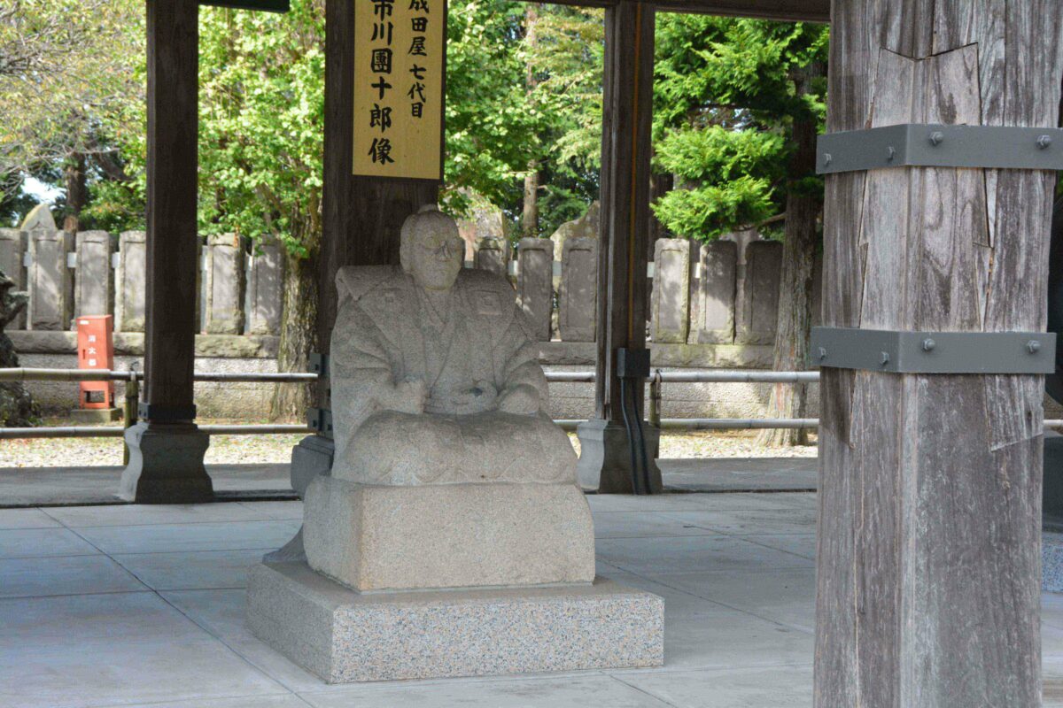 参道を歩き始めて最初に姿を現すのが額堂です。御堂の中央には、成田屋の屋号で歌舞伎を演じる七代目市川團十郎の石像が設けられています。