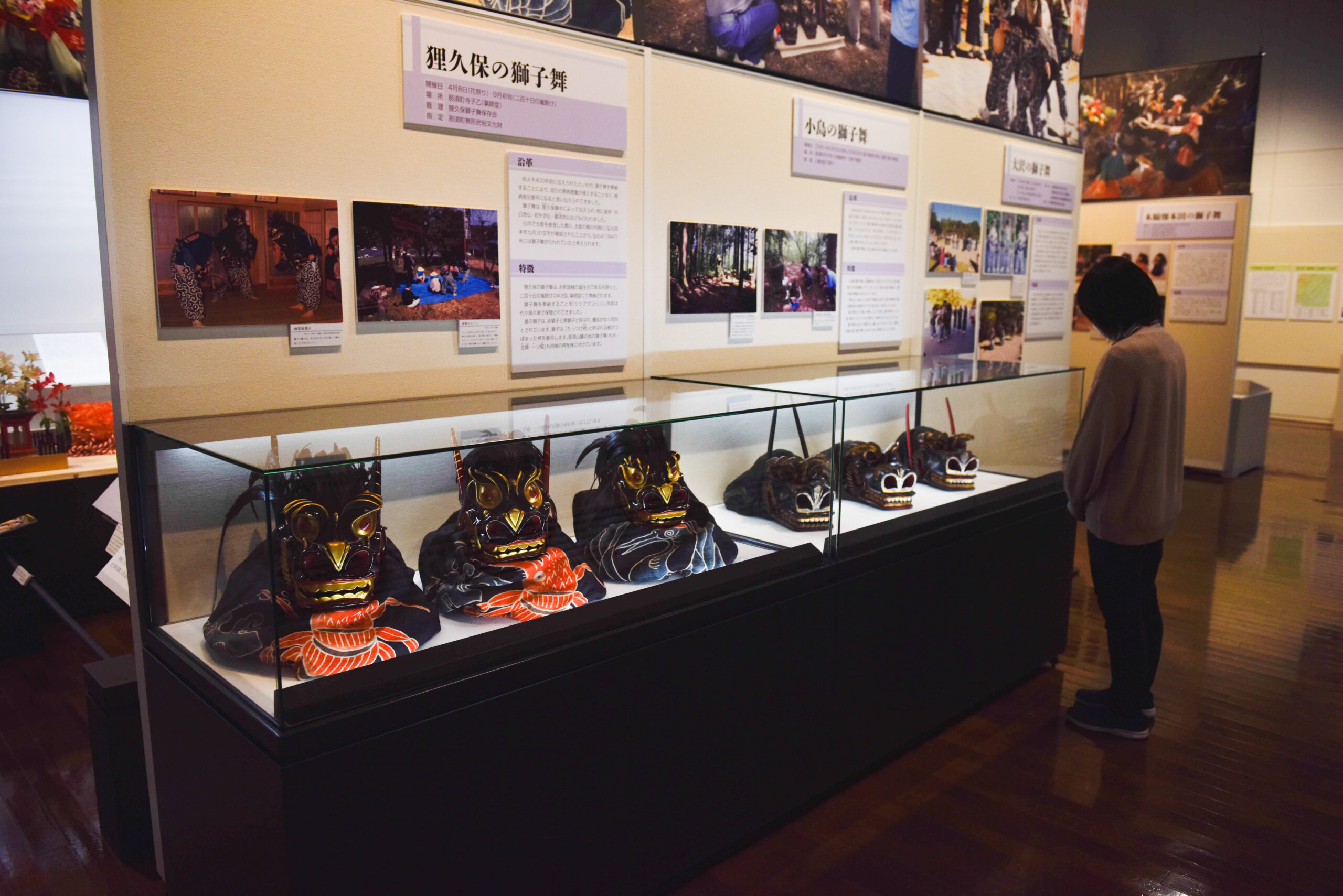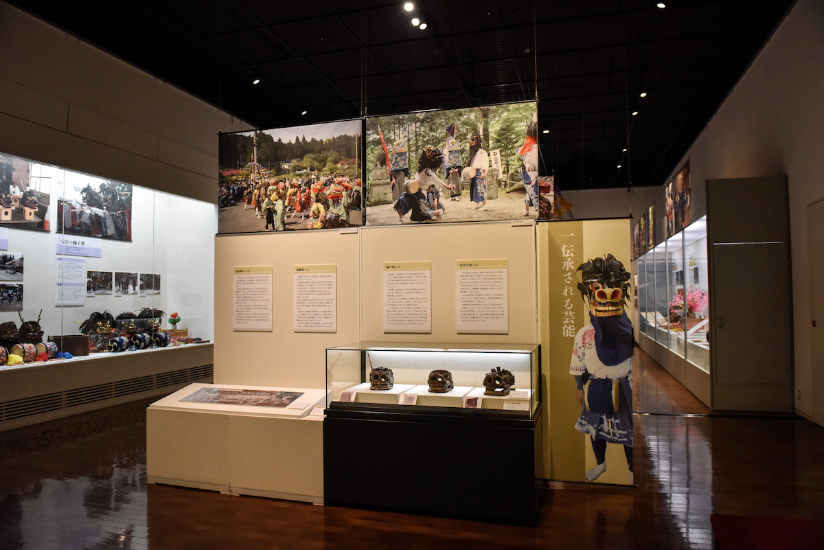 館内に入ると、獅子舞をはじめとした民俗芸能の祭り道具が出迎えてくれた。今回は取材ということで、那須野が原博物館の学芸員・坂本菜月氏に展示について詳しく解説いただいた。「那須地域には様々な獅子舞があります」と教えていただき、獅子頭、衣装、太鼓など全ての地区がそれぞれ独自の形態を伝承していることを知ることができた。