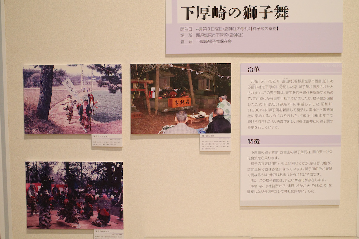 栃木県那須地域の獅子舞というと、何を思い浮かべるだろうか?栃木県の中でもとりわけ獅子舞の伝承数が多い那須地域では、16地区で一人立ちの三匹獅子舞が行われている。今回、インターネットで検索したところ、那須塩原市の那須野が原博物館で大規模な獅子舞をはじめとした民俗芸能の展示を行っていることを知った。展示内容も凝っていて、獅子舞に対する熱い思いを持った方々がいるのでは?と直感的に感じた私は、早速現地に向かった。