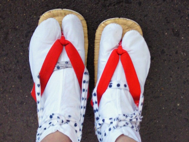 最近はスニーカーで参加する人もいますが、正式にはやはり足袋&わらじ。手拭いを引き裂いた紐でしっかりくくってください。履きなれないわらじ。紐がほどけたり、パカパカして動きづらいので、しっかり結んでください。
