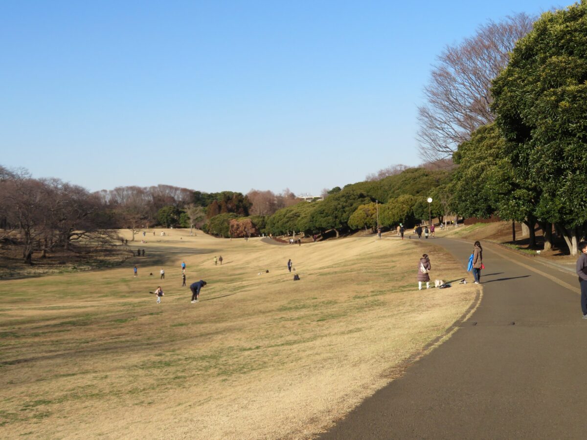 根岸森林公園の正門は公園の南端、バス停の旭台近くに設けられています。門を潜ると見渡す限りの芝生広場です。元気な子どもであれば、思わず駆け出してしまうことでしょう。