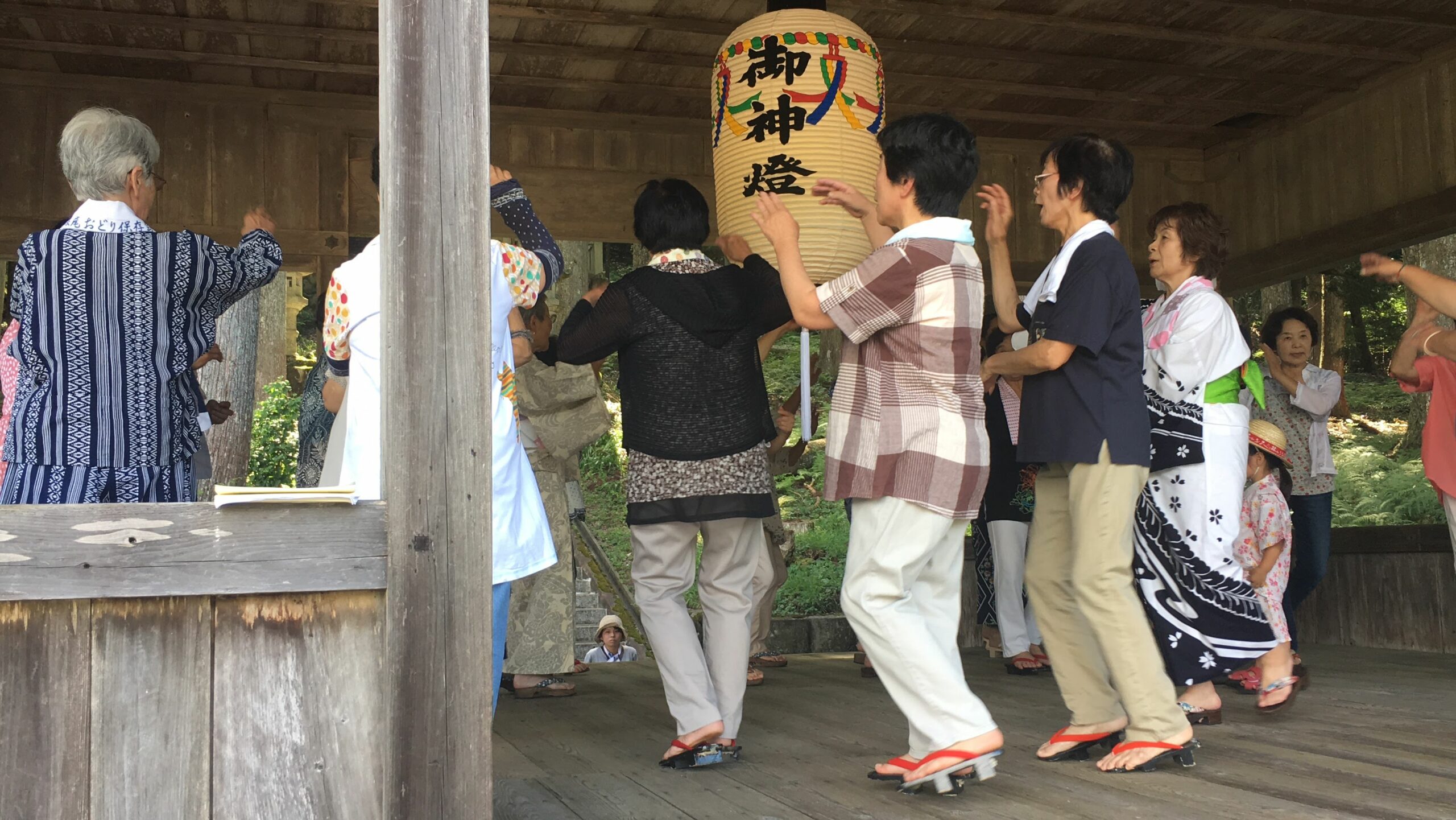 2018年7月。筆者が再び根尾を訪問した際の写真。神社の拝殿でケーブルテレビの撮影が行われ、ご婦人たちが踊った。