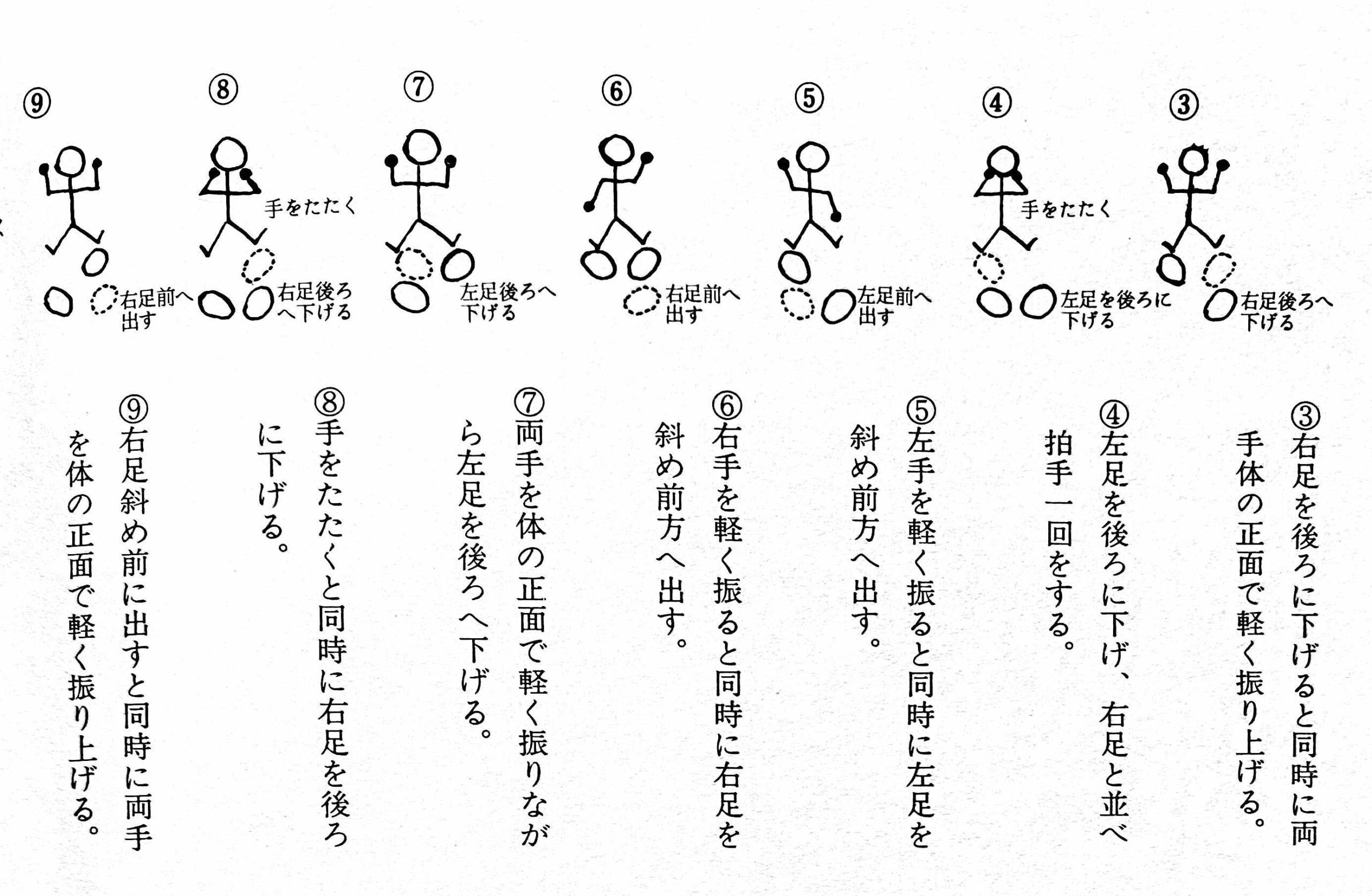 盆踊りなどの振り付けは従来、画像のようにテキストとイラストで記録されてきた。しかし、これを見ただけでは、なかなか踊り方を理解することは難しい。 出典:『奥越前の民俗芸能』(大野市文化協会)