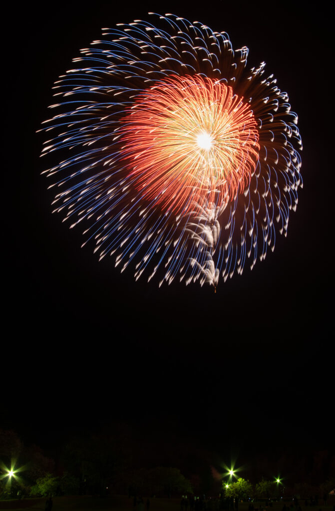 一つ目は、打ち上げ場所の変更です。今までは打ち上げる場所の関係上花火玉の大きさは最大7号玉(上空で開いた時の大きさは直径250m)でしたが、今回の変更により最大10号玉(上空で開いた時の大きさは直径320m)になりました。