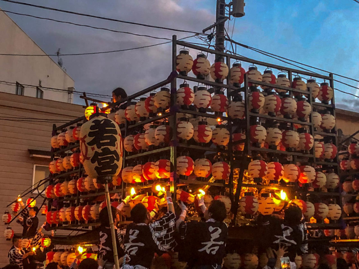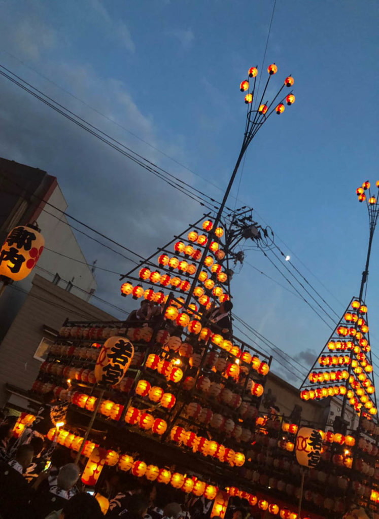 七台の太鼓台と呼ばれる山車に約300個の鈴なり提灯を灯し市内を練り歩きます。
