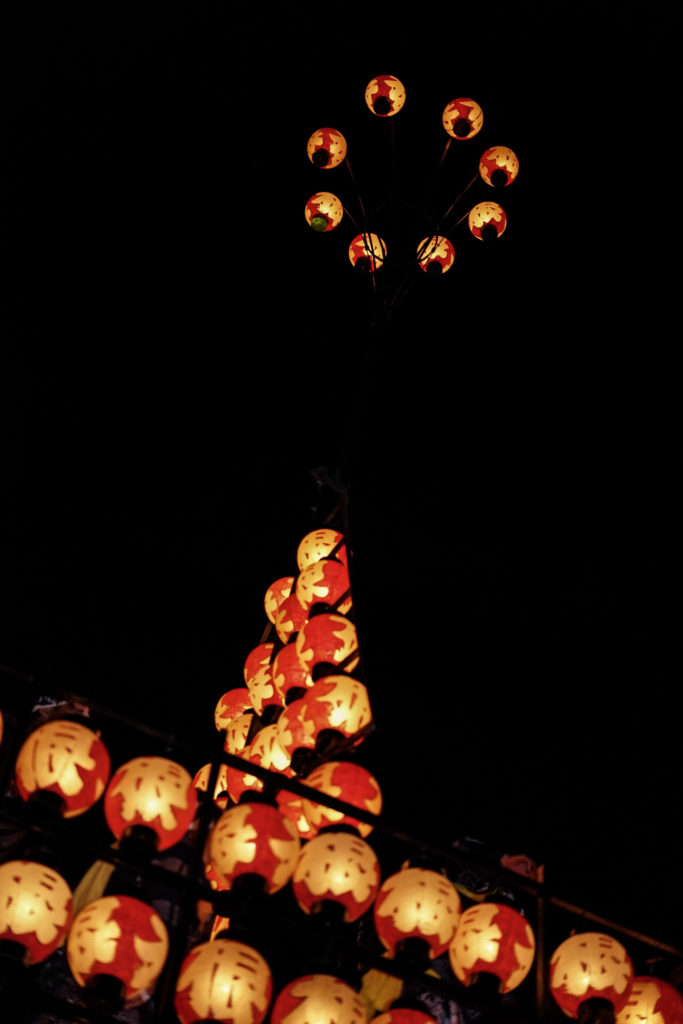 威勢よく引き廻しが行われたあとの、整然と立ち並ぶ7台と夜空に浮かぶ紅提灯は「静と動」、「光と闇」の情緒が感じられるシーンです。