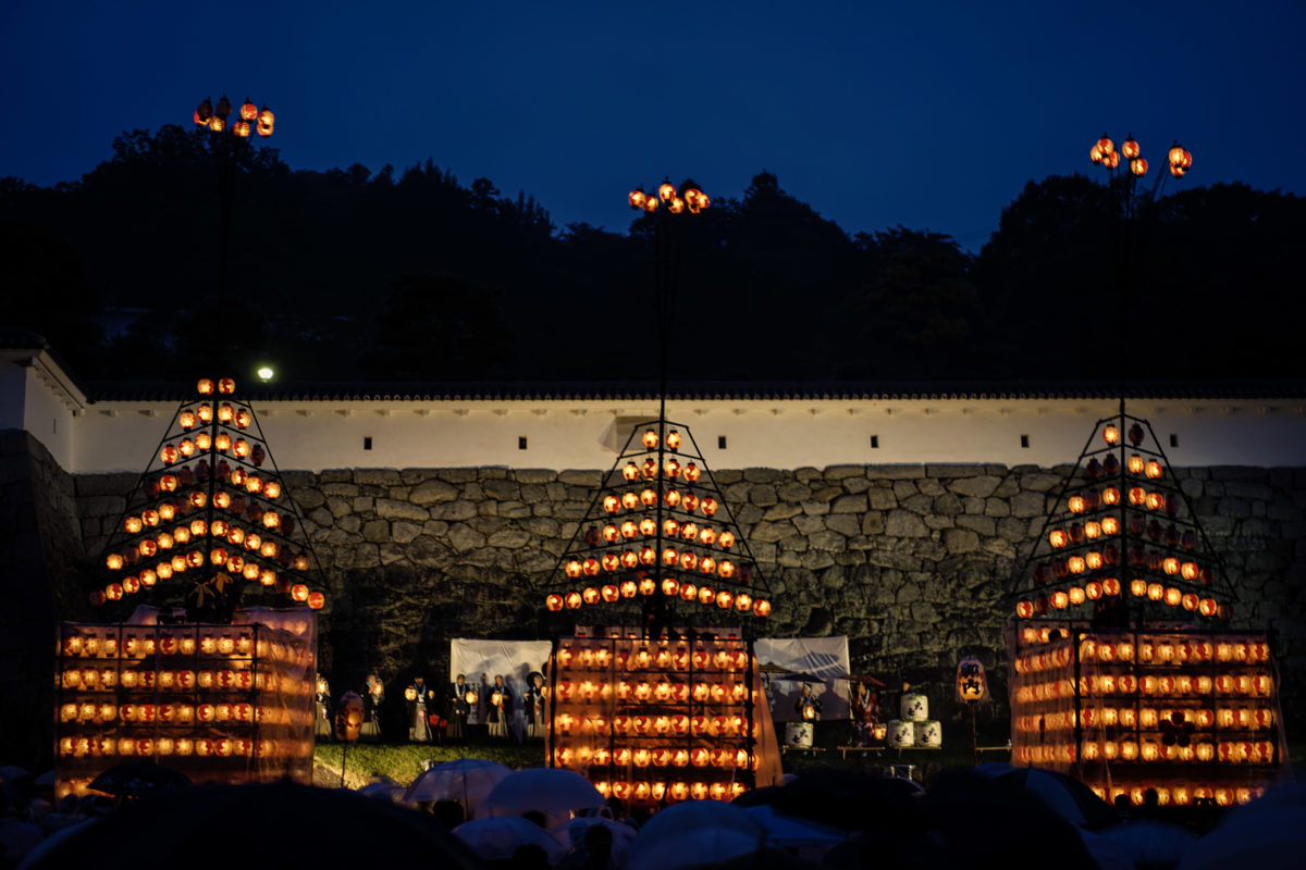 特に3町合同引き廻しの最後の舞台は霞が城跡前。城前の道が「日本の道100選」に選出されており、城壁の周りを囲む松の木や石垣から歴史を感じながら城跡へたどり着きます。日暮れに応じて徐々に提灯の灯りが浮かび上がっていきます。歴史の積み重ねを感じる石垣と提灯のタイアップが見事です!