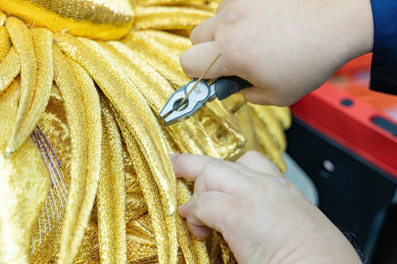 その昔、色とりどりの羅紗を使い刺繍されていた太鼓台の飾り幕ですが、新居浜ではそれが金一色になり、代わりに立体刺繍による陰影や凹凸といった誇張表現が好まれるようになりました。