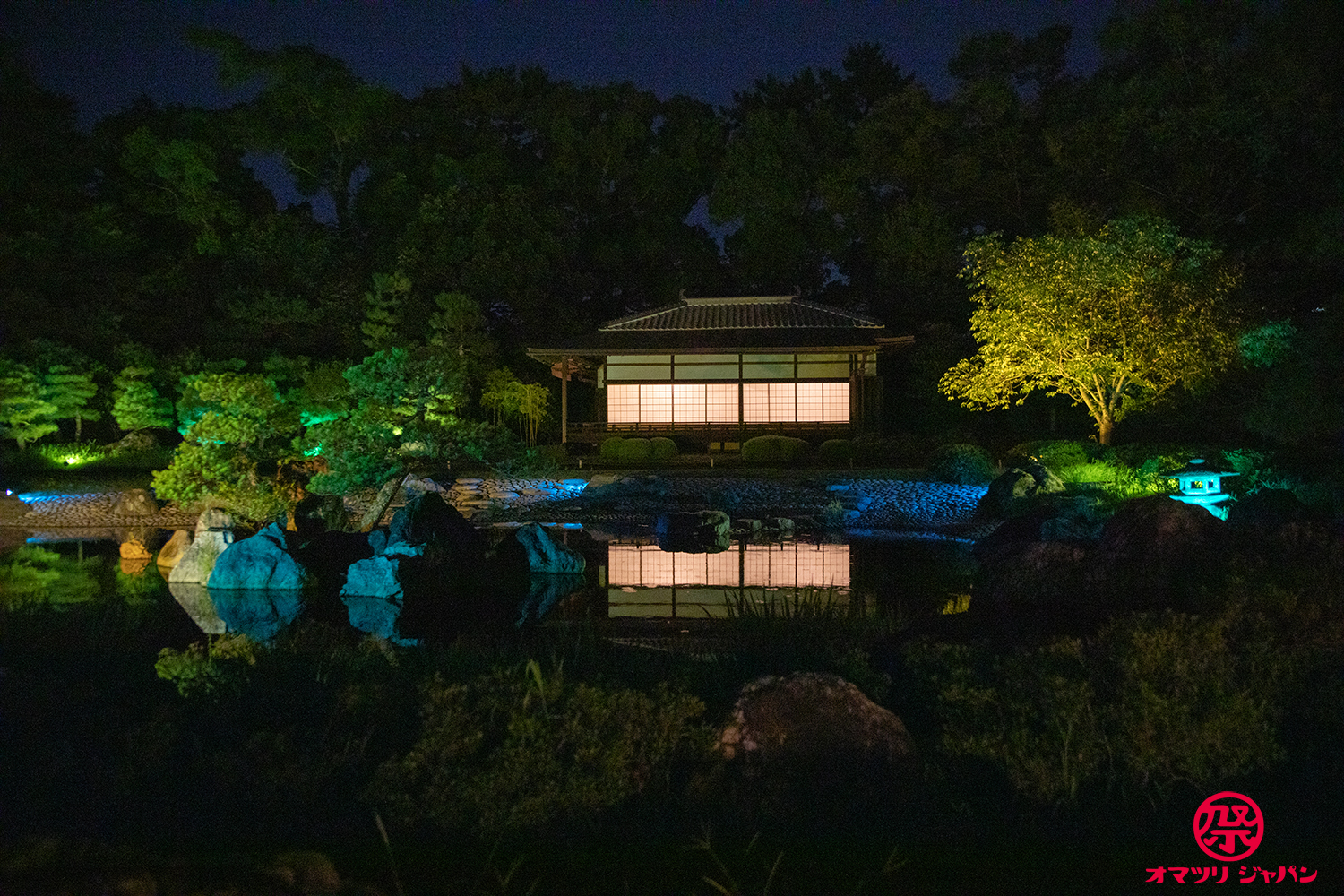 もう一つのおすすめの見方は内堀沿いに進んだ、清流園の方角からの景色。同じライトアップでも奥行きのある構図になります。