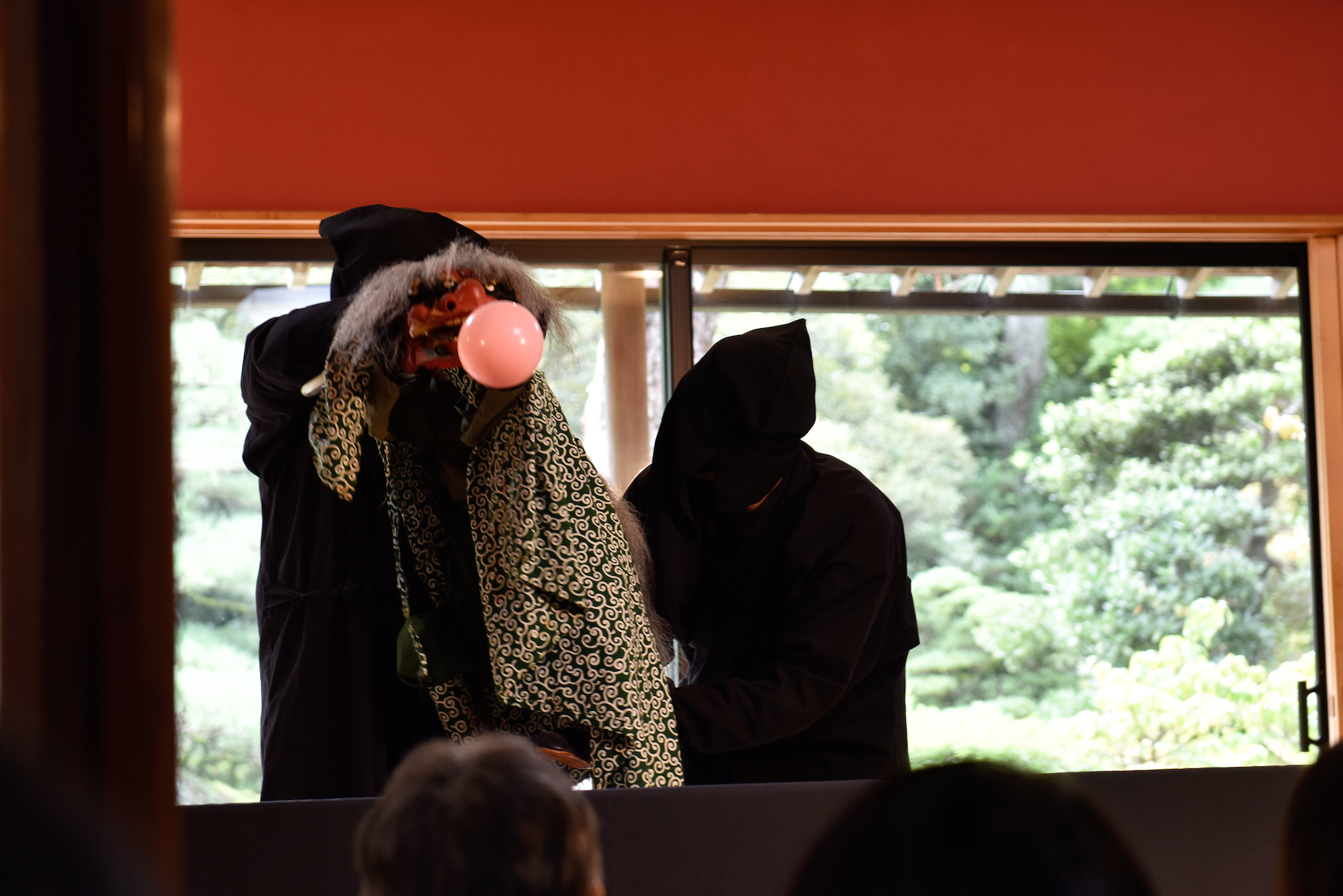 演目の意図としては、雄獅子がおかめと雌獅子を間違ったことに対して、雌獅子に許してもらおうとする様子をコミカルに描きながら、新型コロナウイルスによる苦境を一緒に乗り越え、みんなで一緒に笑い合おうという意味が込められている。以下の写真は、登場した獅子がおかめに渡された風船ガムを、プクーッと膨らませる様子。ここから、会場内には笑いがあふれ、和やかな雰囲気に包まれていった。