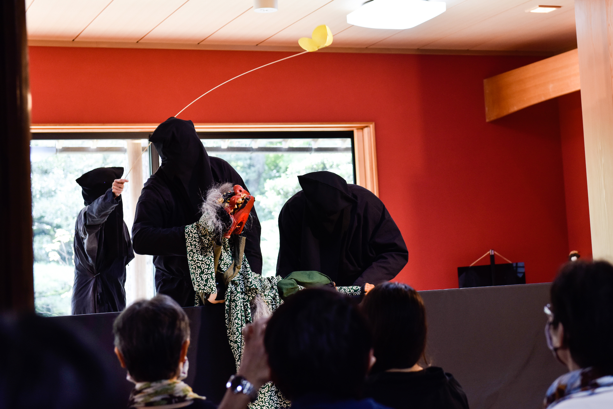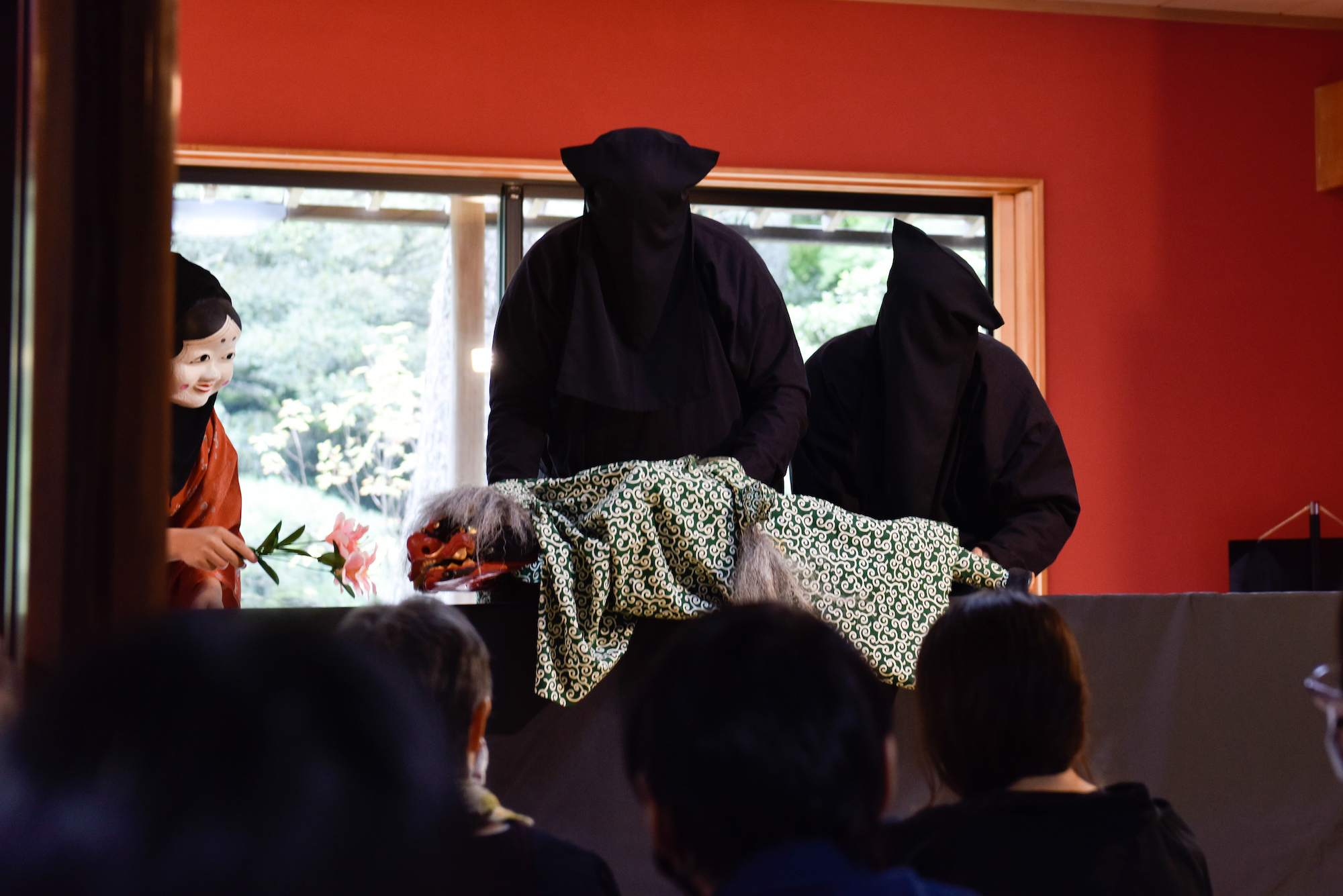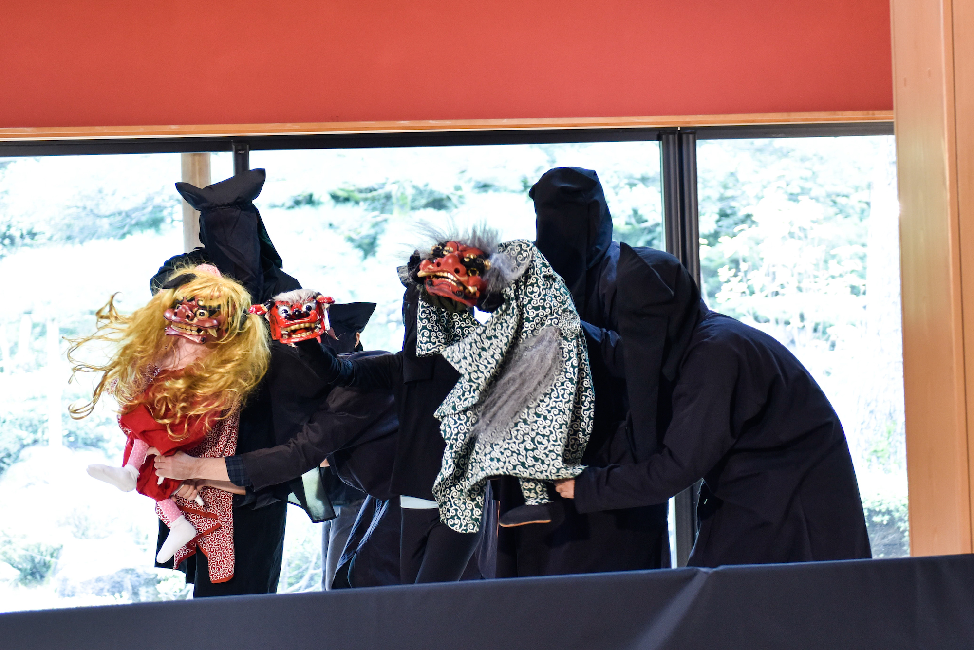 ホルマンさんのトークの後、石川県白山市内に受け継がれる伝統的な人形浄瑠璃が披露された。まず初めは、東二口(ひがしふたくち)文弥人形浄瑠璃保存会による「大織冠(たいしょっかん)」という演目。江戸時代の古浄瑠璃の演目で、香川県「志度の浦」に伝わる玉取伝説を脚色して制作された、宝珠を巡る争いの物語である。