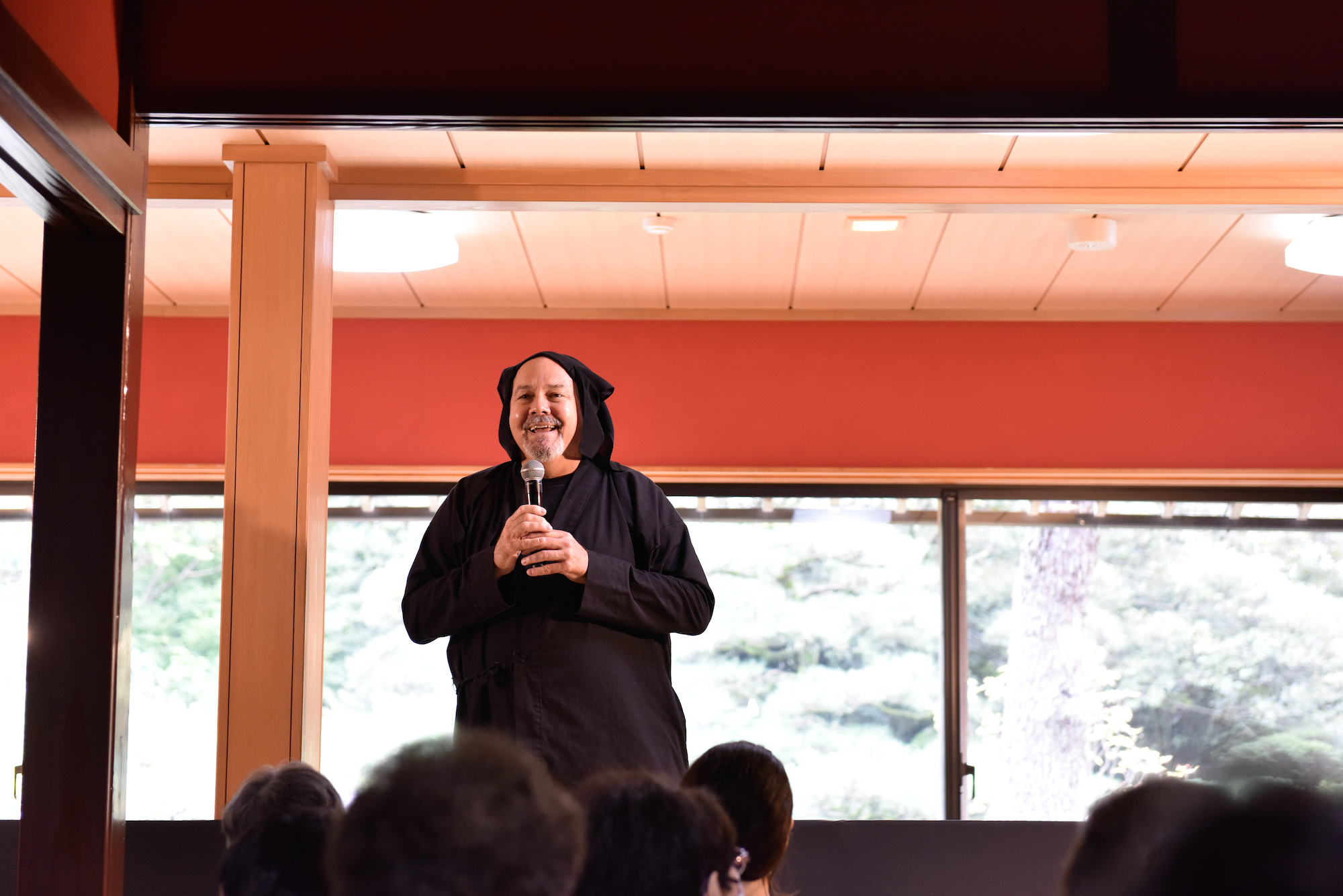 このイベントはまず、人形浄瑠璃の研究家、マーティン・ホルマンさんのトークから始まった。ホルマンさんは、白山市の姉妹都市である米国コロンビア市内のミズーリ州立大学の元教授で、現在は徳島市に移住して人形浄瑠璃研究家を務める傍ら、関西学院大学の講師をお務めだ。近松門左衛門が脚本を描いた「曽根崎心中」の繊細な動きに感動して、日本の人形浄瑠璃に興味を持ったという。