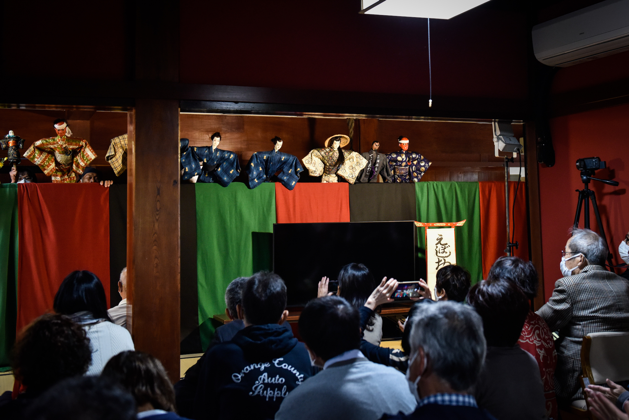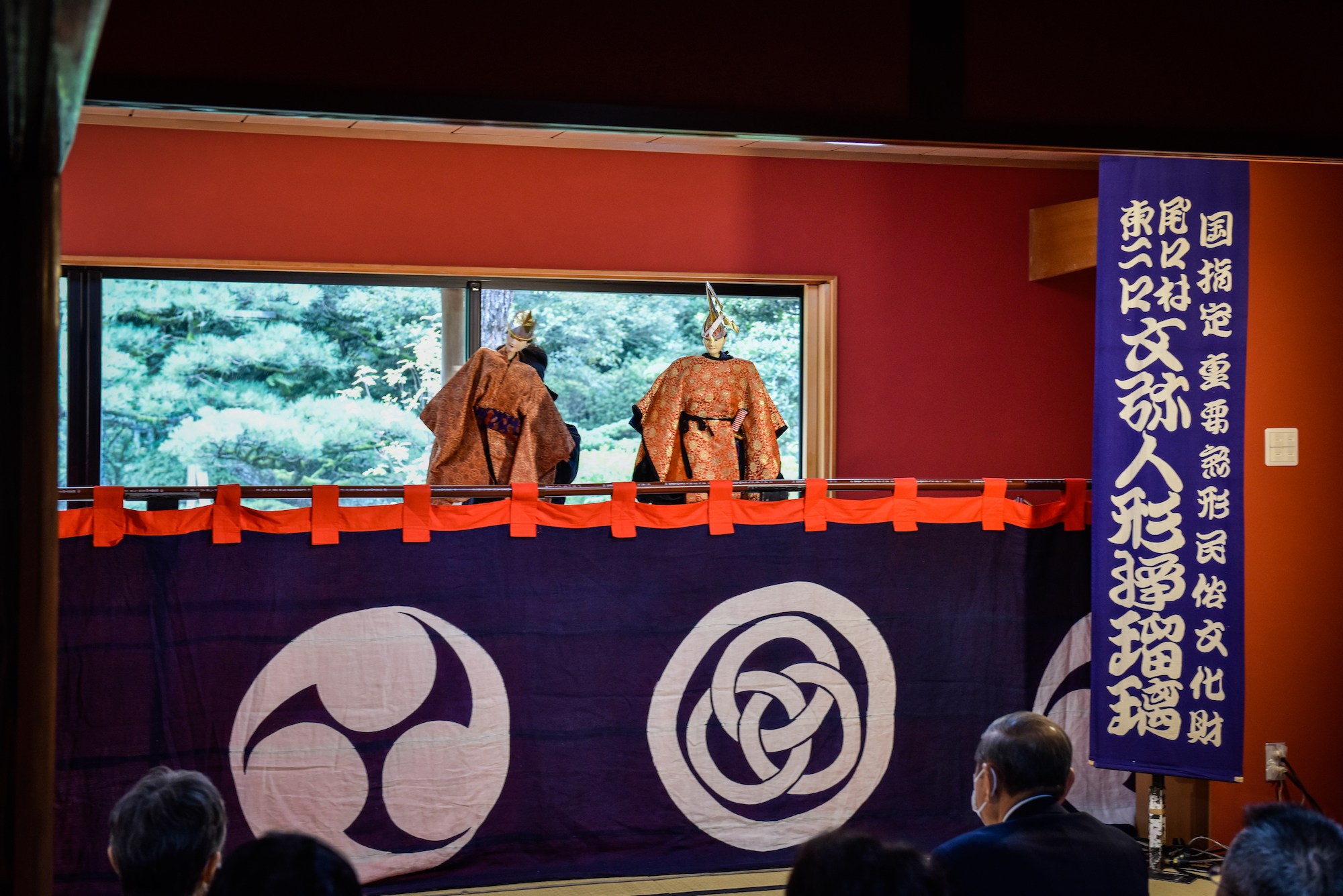 ホルマンさんのトークの後、石川県白山市内に受け継がれる伝統的な人形浄瑠璃が披露された。まず初めは、東二口(ひがしふたくち)文弥人形浄瑠璃保存会による「大織冠(たいしょっかん)」という演目。江戸時代の古浄瑠璃の演目で、香川県「志度の浦」に伝わる玉取伝説を脚色して制作された、宝珠を巡る争いの物語である。