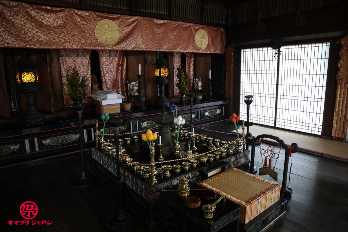 歴代門跡(天皇ゆかりの和尚様)を祀っている霊明殿では朝6時から門跡が朝のお勤め「勤行(ごんぎょう)」を行なっています。(非公開)