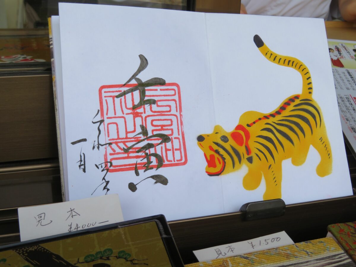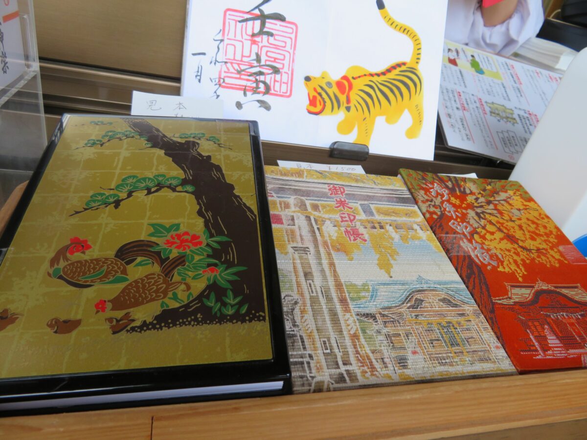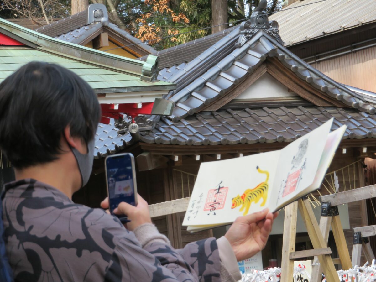 特別御朱印や月替わりの御朱印も準備されており、「下総三山の七年祭り」の特別御朱印は、見開きの2倍サイズの紙面に切り絵が施されています。2022年1月の御朱印には寅が描かれ、拝殿をバックに写真を撮影したくなります。